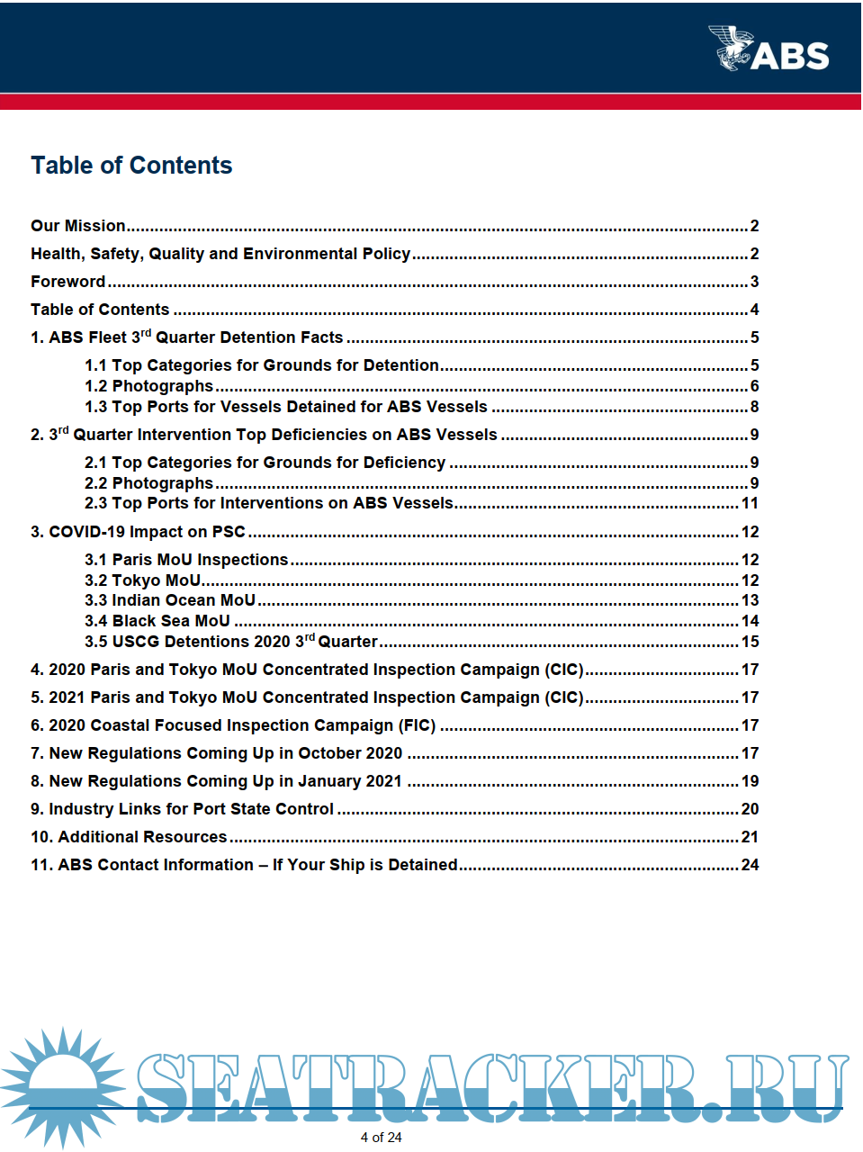 Year: 2020 Language: english Author: ABS Format: PDF Quality: eBook Number of pages: 24 Description: This ABS Quarterly Report on Port State Control (PSC) provides information to owners on deficiencies identified on ABS vessels during inspections carried out by the various PSC regimes globally during the third quarter of 2020. This report is being made available to assist owners by providing awareness of potential areas of concern that have been identified on ABS classed vessels.