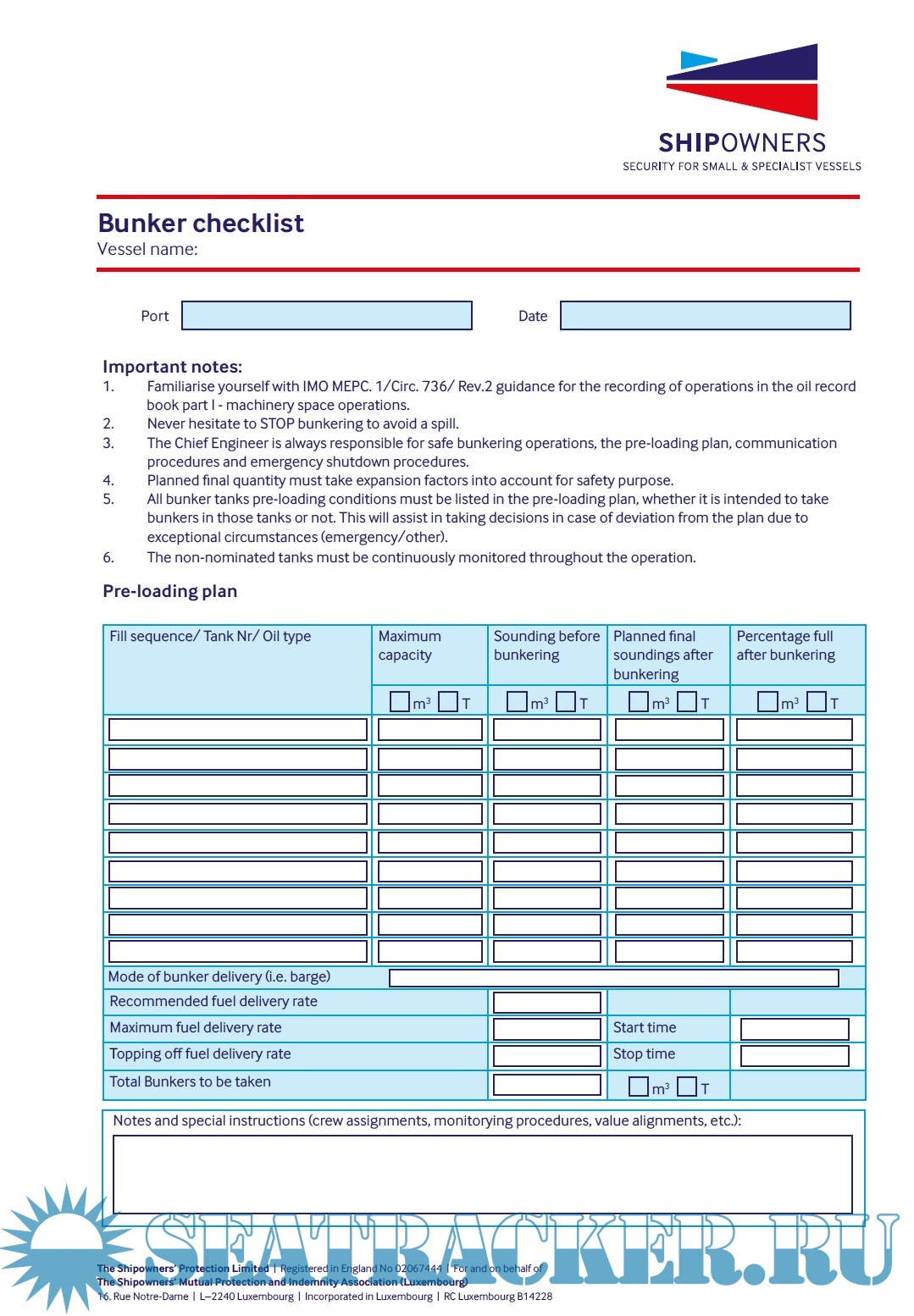 An useful Bunker checklist, from Shipowners', as fillable pdf, usable as an electronic or paper document.