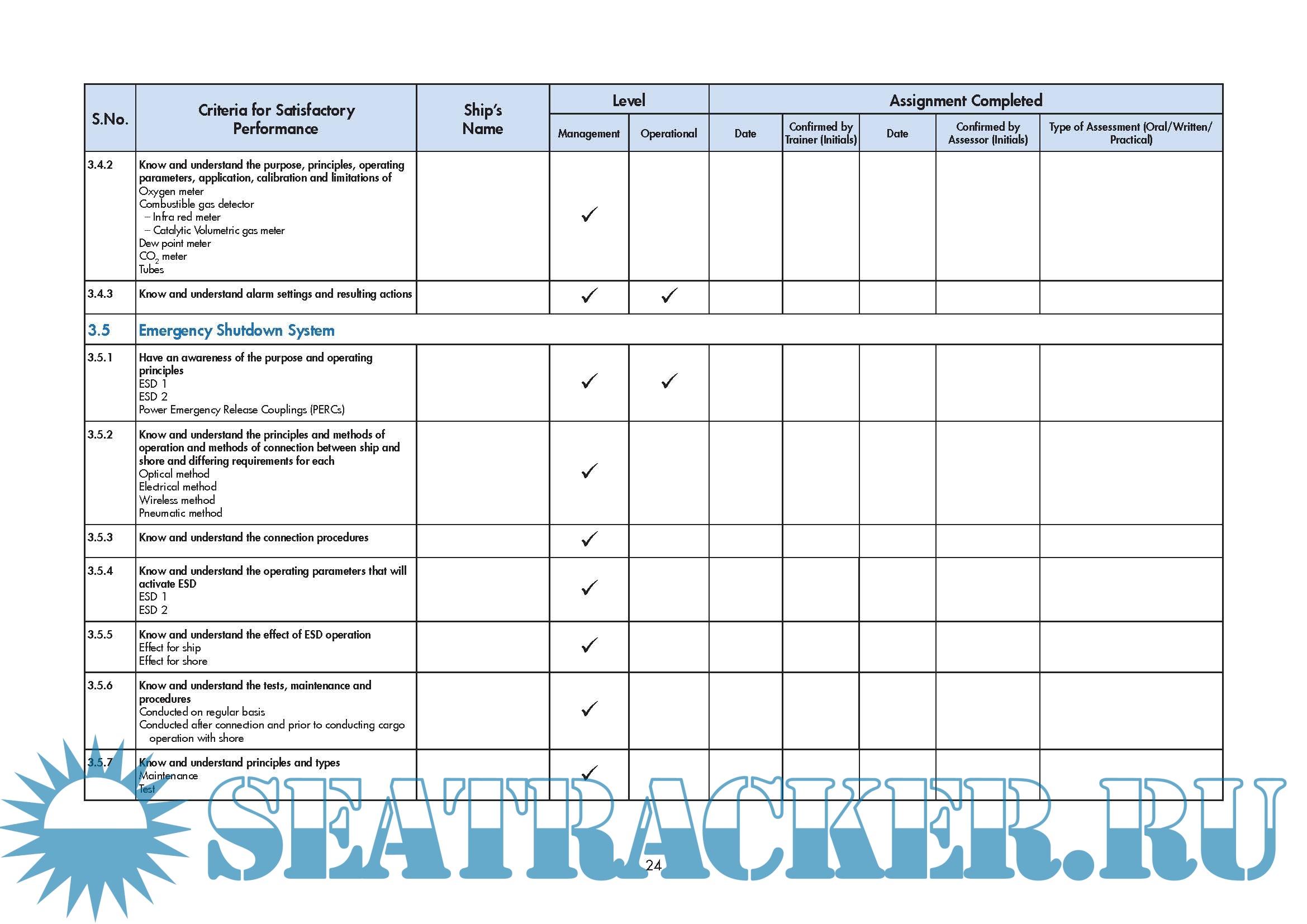The book provides space to record details of the ship(s) on which sea service is being undertaken and its trading itinerary during the qualifying period. It lists the training and tasks to be undertaken and there is provision for the Master and supervisor to sign the book to confirm satisfactory completion. The tasks are grouped under broad areas of activity and include: