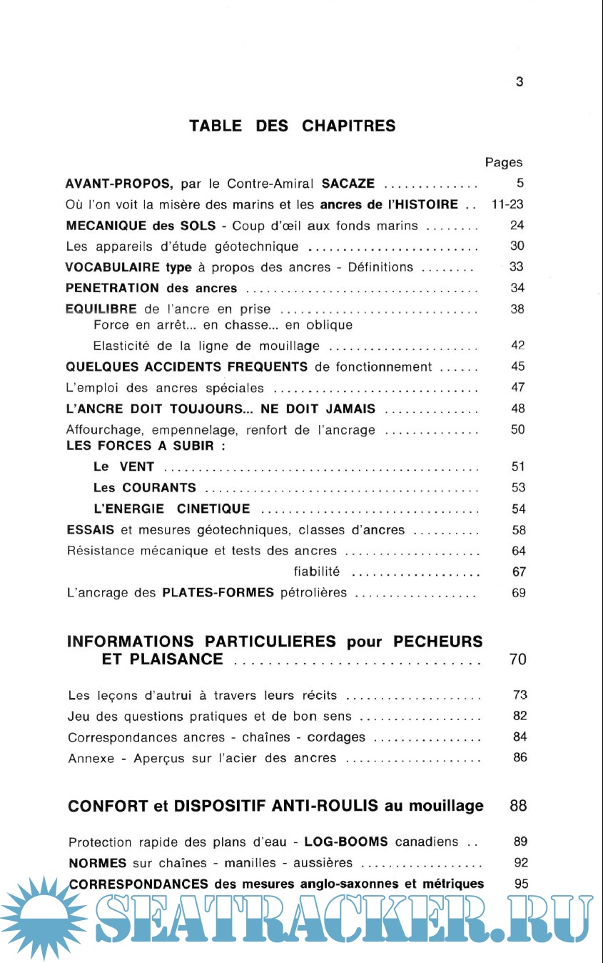 Description: This booklet is a fascinating and comprehensive manual that deals in depth with anchor types and their characteristics, resistance under load, nomenclature, forces acting on the ship, types of seabed, and holding power. Data are deduced directly from the author's experience and from tests carried out at sea under controlled conditions, in collaboration with the Bureau d'Etudes and the Société Nationale de Sauvetage en Mer. There is no shortage of examples taken from real cases and useful tables with dimensions and mechanical features of lines, chains and hardware.