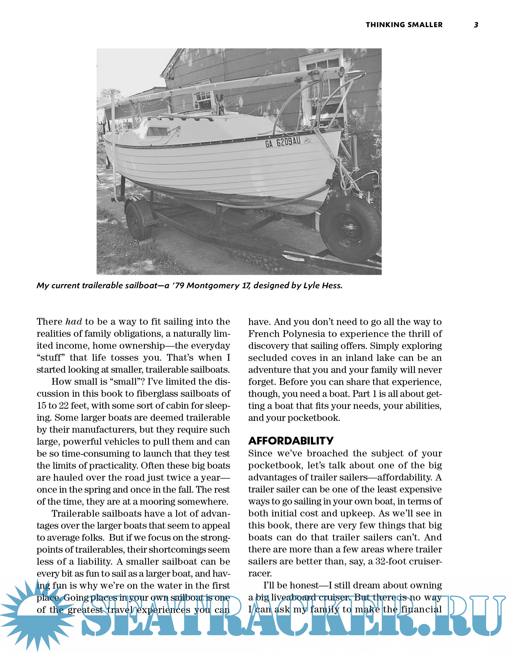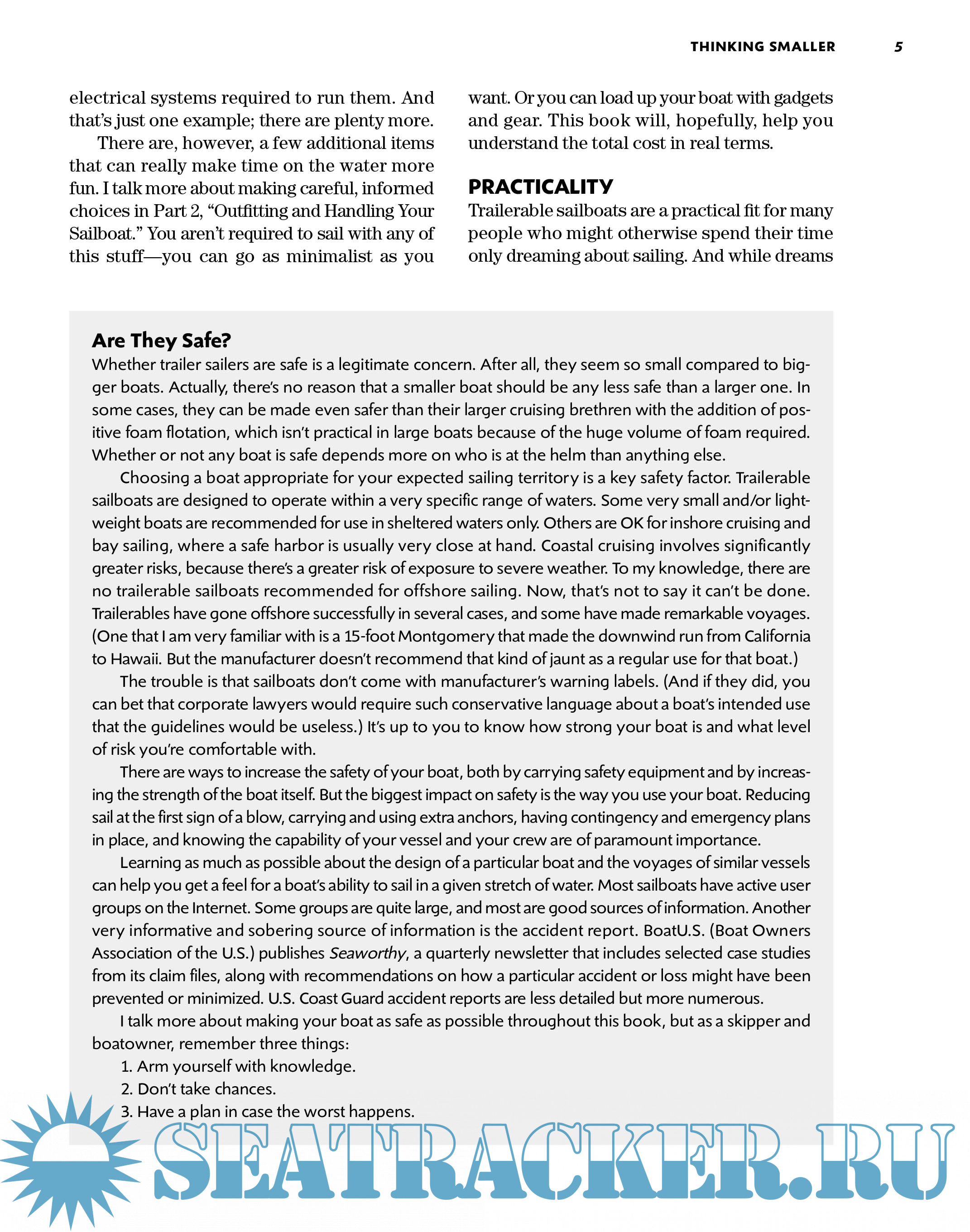 Year: 2009 Language: english Author: Brian Gilbert Genre: Reference book Publisher: International Marine / McGraw-Hill ISBN: 978-0-07-159360-1 Format: PDF Quality: eBook Pages count: 273 Description: A soup-to-nuts introduction to small, economical sailing craft Trailer sailers--the smallest, most economical sailboats with sleeping accommodations--are a popular platform for learning the basics of sailing and are often considered to be the entry level to cruising under sail. Author Brian Gilbert shows how trailer sailers can be the ideal craft for a lifetime of enjoyment, including serious, long-distance cruising. This book covers all the bases, including how to inspect, buy, and equip a boat; how to trailer, sail, navigate, and cruise in small boats; how to use communications and navigation equipment; and more.