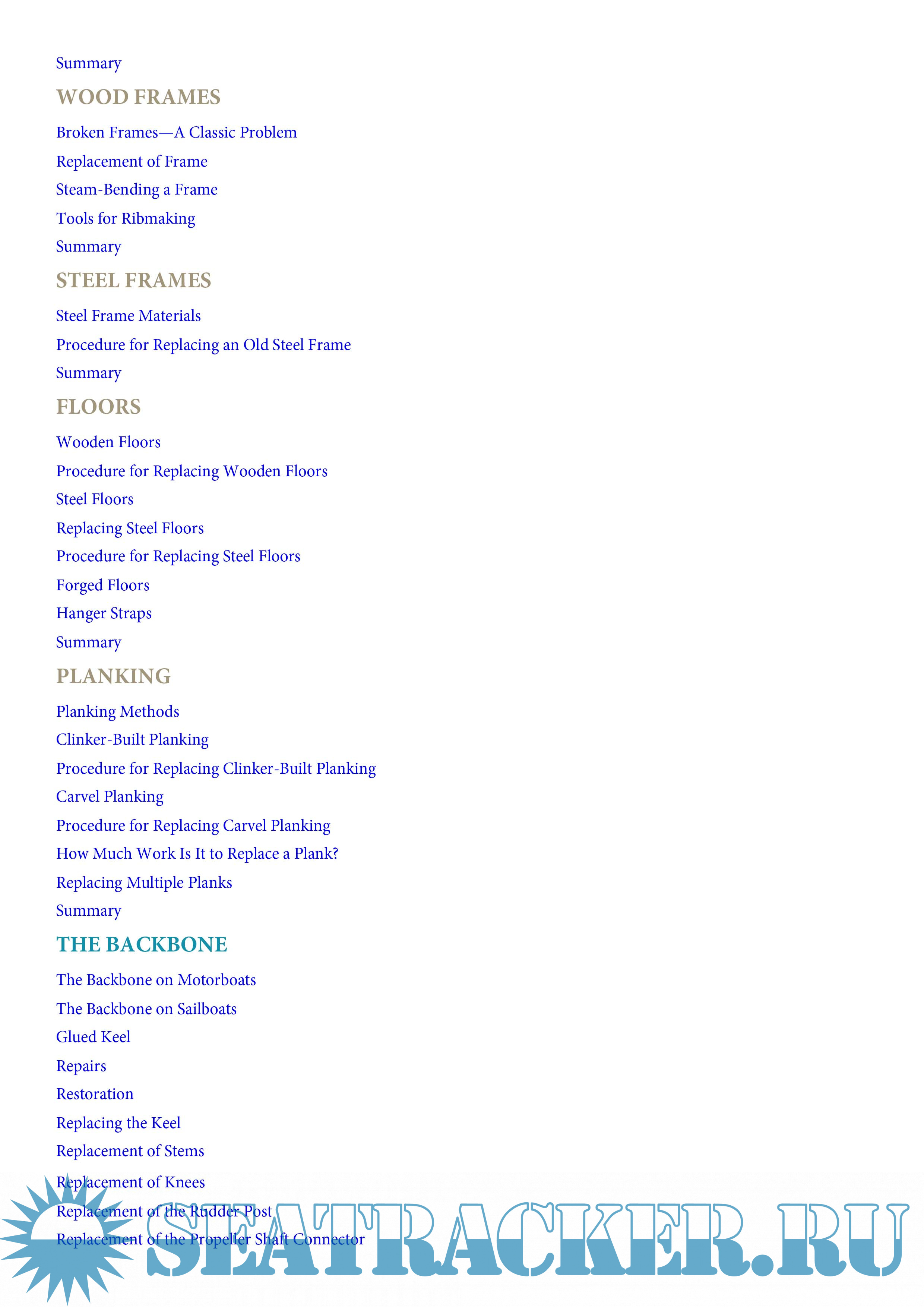 Year: 2013 Language: english Author: Thomas Larsson Genre: Reference book Publisher: Skyhorse Publishing, Inc. ISBN: 978-1-62087-051-8 Format: PDF Quality: eBook Pages count: 315 Description: The Big Book of Wooden Boat Restoration is the perfect introduction or reference guide for wooden boat lovers both experienced and new. Author Thomas Larsson, one of Sweden's most experienced and premier wooden boat restorers, has gathered his thorough knowledge of the subject for the reader and placed it in this book with informative facts and an extensive glossary, accessible to new hobbyists and longtime boat lovers alike. This book contains chapters on boat care, including winter maintenance, racing, finishing, and stripping. You will also find current information on boat building, gluing, and tools. The most extensive part of this book consists of chapters that describe the detailed clean repair of wooden boats”everything from plug-accession and bonding to changing socks and bottom engine installation. Larsson includes a history of boat building and provides a nice glimpse of different wooden boats with over 200 sketches and photos in both color and black-and-white. He explains how staying on top of maintenance keeps a unique fleet of wooden boats alive. With practical instructions and fact-boxes with advice and tips, this book will teach you all about maintenance: surface treatment, scraping the hull, equipping the boat in the spring, and looking after it in the winter, as well as tips about buying a boat, installing an engine, and more.