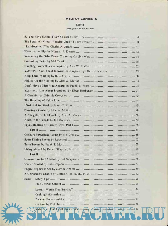 Year: 1966 Language: english Author: Sindle H. Publisher: Yachting Publishing Corporation Format: PDF Quality: Scanned pages Pages count: 100 Description: Originally published in Yachting during the past few years, these articles written by experienced boatmen have been selected with the following in mind: that they be discursive and touch on the various aspects of power boating, and their value be enduring and practical. It is a sampling, at best, from selected pages of Yachting. It is hoped that our ranging from the "nuts-and-bolts" type article to factual (and perhaps more glamorous) cruising stories will give the reader continuing satisfaction.