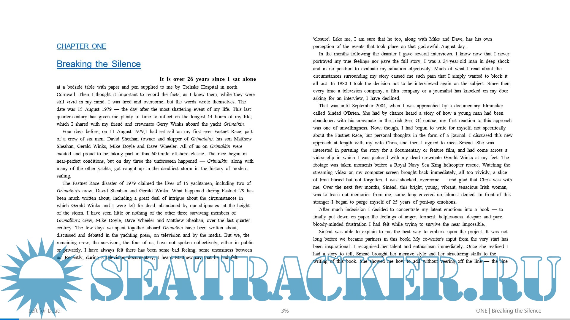 Description: In August of 1979, Nick Ward began the 600-mile course of the UK's Fastnet Race with perfect weather. Within 48 hours, the deadliest storm in the history of modern sailing had blasted through the Irish Sea. By the time it had passed, it had thrown one of the world's most prestigious races into bedlam and taken the lives of fifteen sailors. Ward's boat, Grimalkin, was capsized again and again, and the skipper lost overboard; after hours of struggle, three of the crew fled the boat for the liferaft. Nick and his crewmate Gerry, both injured, unconscious, and presumed dead, were abandoned on the beleaguered yacht. Gerry died a few hours later, and Nick was left alone to face down a storm that has become legendary among sailors and racing fans alike…