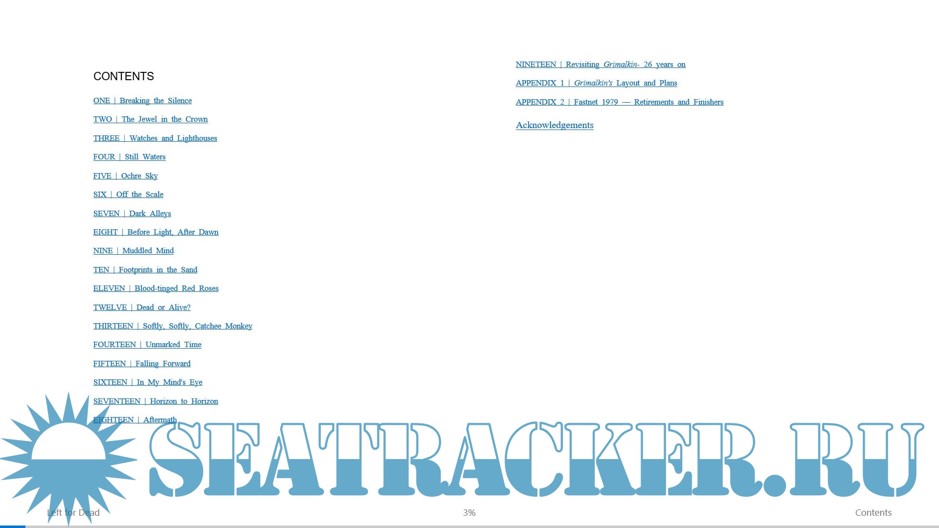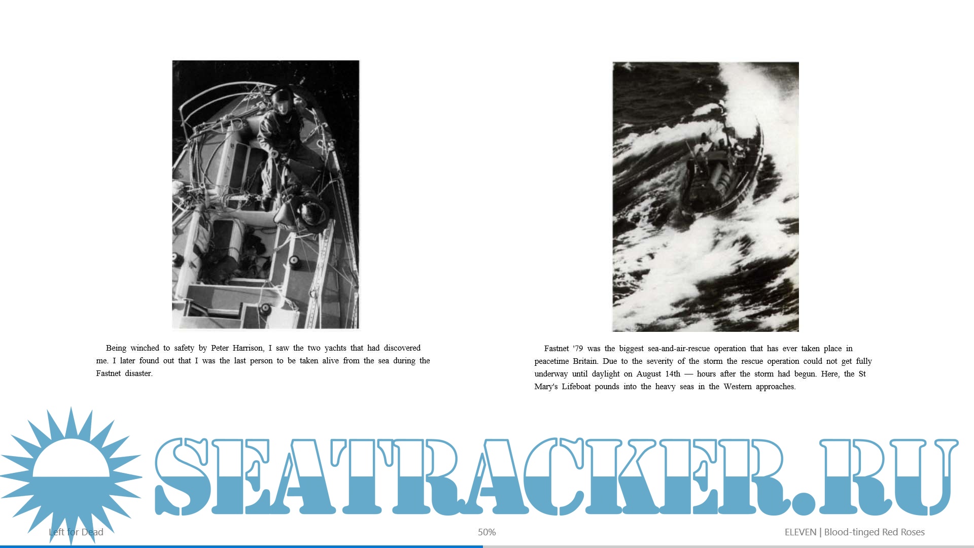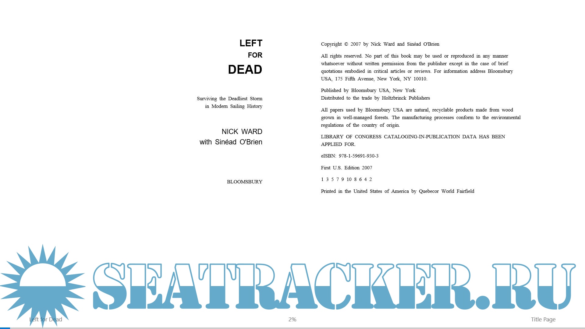 Year: 2007 Language: english Author: NICK WARD Genre: History Publisher: Bloomsbury ISBN: 978-1-59691-930-3 Format: EPUB Quality: eBook Pages count: depends upon the screen resolution Description: In August of 1979, Nick Ward began the 600-mile course of the UK's Fastnet Race with perfect weather. Within 48 hours, the deadliest storm in the history of modern sailing had blasted through the Irish Sea. By the time it had passed, it had thrown one of the world's most prestigious races into bedlam and taken the lives of fifteen sailors. Ward's boat, Grimalkin, was capsized again and again, and the skipper lost overboard; after hours of struggle, three of the crew fled the boat for the liferaft. Nick and his crewmate Gerry, both injured, unconscious, and presumed dead, were abandoned on the beleaguered yacht. Gerry died a few hours later, and Nick was left alone to face down a storm that has become legendary among sailors and racing fans alike… PS See my other releases: https://seatracker.xyz/tracker.p...id=54420#results