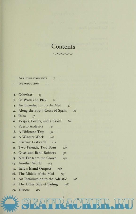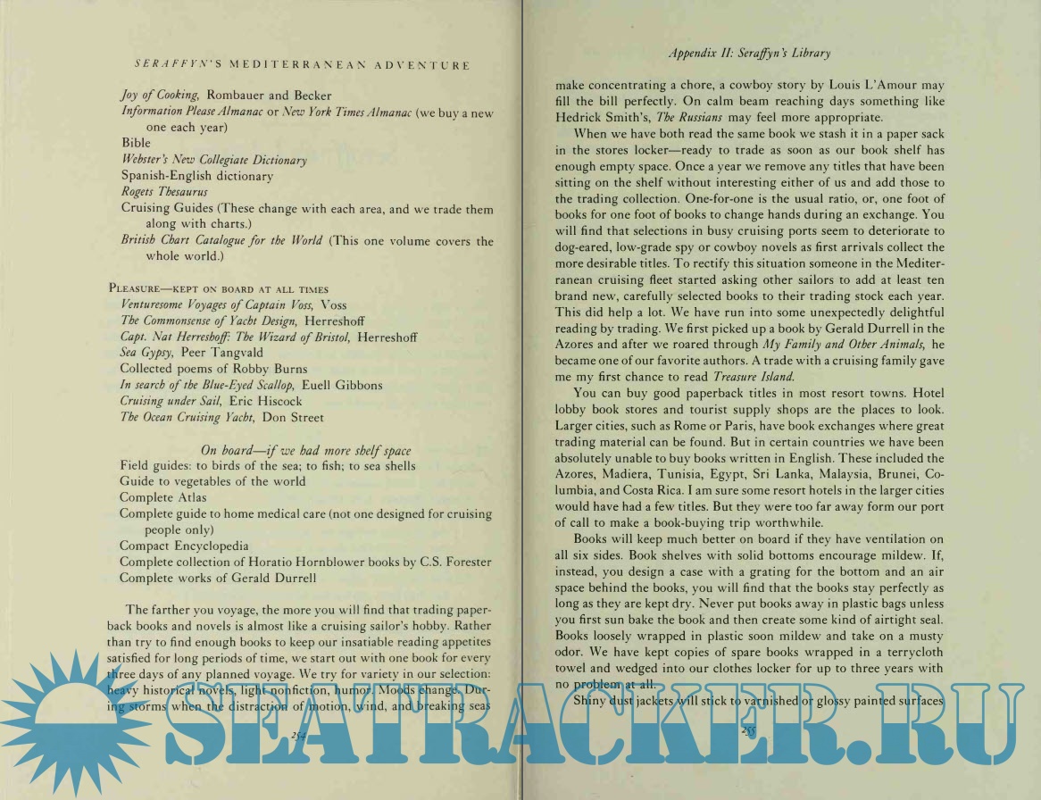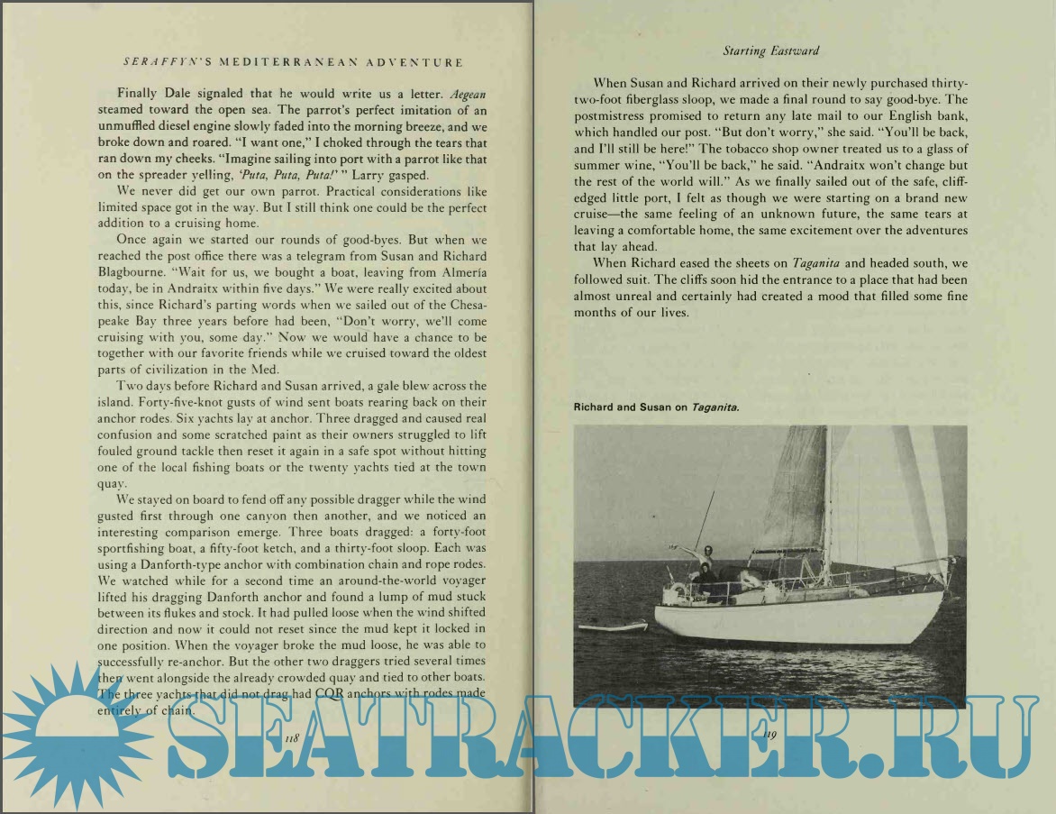 Year: 1981 Language: english Author: Lin and Larry Pardey Genre: Handbook Publisher: W.W. Norton & Company Edition: First ISBN: 0-393-03266-3 Format: PDF Quality: Scanned pages Pages count: 264 Description: Since publication of their first book, Cruising in Seraffyn, a growing audience of Pardey addicts has followed their eleven-year cruise of the world. Seraffyn's European Adventure left the Pardey's in Britain. Now they tell us what happened after they passed Gibraltar and entered the warmer and supposedly more tranquil Mediterranean. Frequently, it lived up to its popular reputation. Just as frequently, it offered them storms and troubles ashore reminiscent of the travails of Ulysses. They explored the Spanish coast and then worked their way back down to the African coast and the Arab world. They tracked Nelson's fleet on its way to the Battle of the Nile and visited Carthage. They called in at Malta before sailing the Adriatic to Trieste and on along the Dalmatian coast to the Greek islands. Along the way, they found themselves smuggling—not drugs, but twenty dollars' worth of noodles! At Rhodes they left Seraffyn for a time while they hired out as ferry pilots to sail another man's boat home to New Orleans. This time they found themselves to be unwitting smugglers of something far different and more dangerous than pasta.