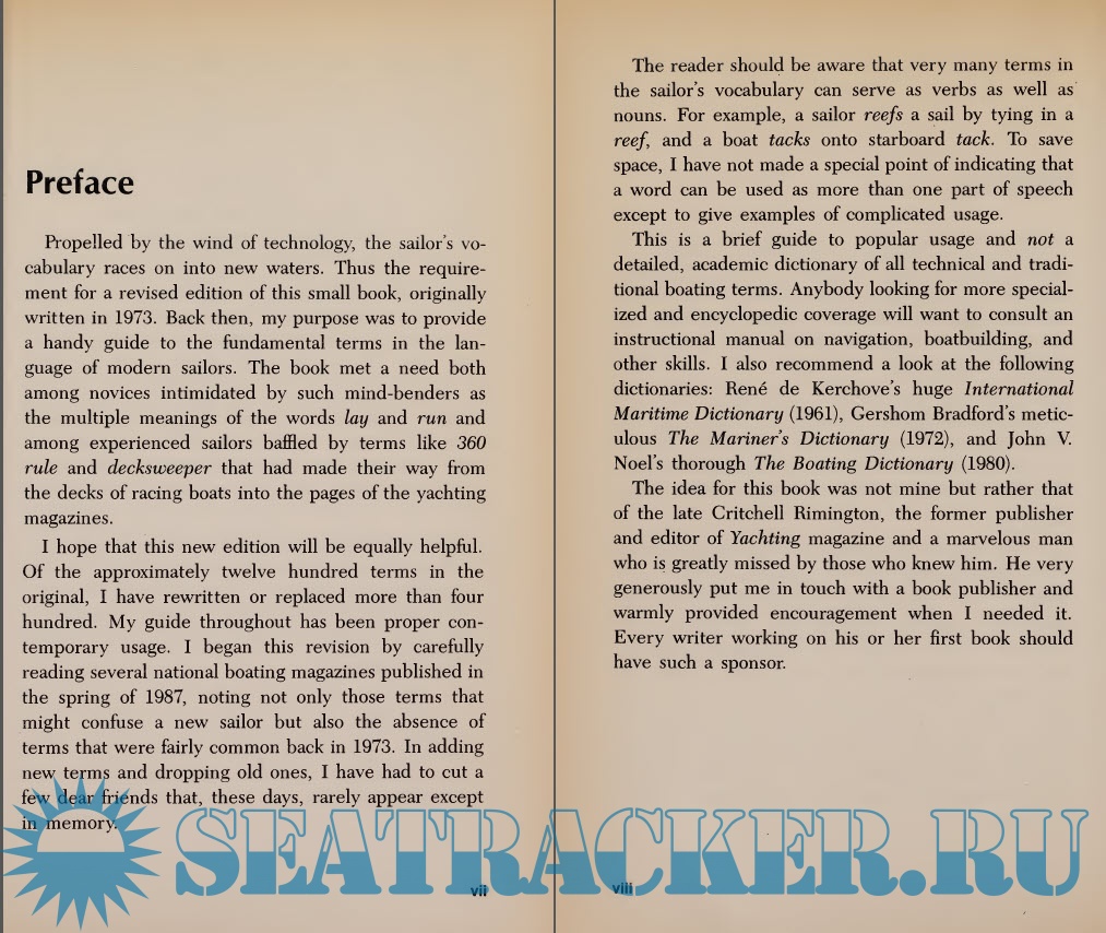 Year: 1989 Language: english Author: John Rousmaniere Genre: Dictionary Publisher: G. P. Putnam's Sons Edition: Revised edition ISBN: 0-399-15005-6 Format: PDF Quality: Scanned pages Pages count: 132 Description: Explains 1200 of the most important terms in the language of the modern sailor, including terms on racing, navigation, and safety