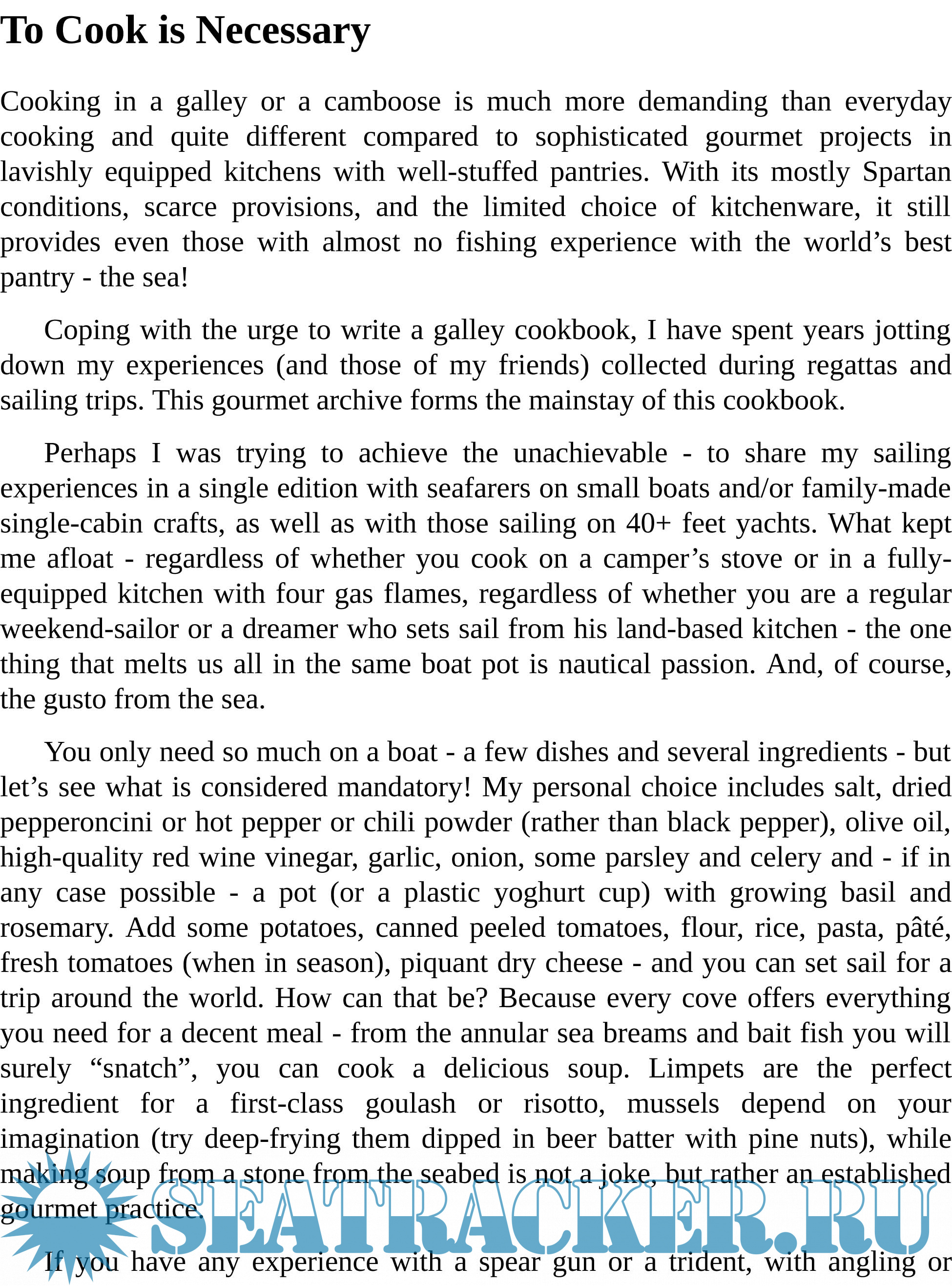 Cooking in a galley or small sailboat is much more demanding than everyday cooking and quite different compared to sophisticated gourmet projects in lavishly equipped kitchens with well-stuffed pantries. With its mostly Spartan conditions, scarce provisions, and the limited choice of kitchenware, it still provides even those with almost no fishing experience with the world’s best pantry - the sea!