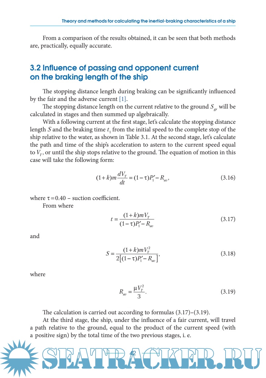 Year: 2020 Language: english Author: Kalinichenko Y. Genre: Technical book Publisher: PC Technology Center ISBN: 978-617-7319-30-5 Format: PDF Quality: eBook Pages count: 76 Description: One of the most serious problems of modern navigation is the accident rate that occurs due to inept or belated maneuvering of ships. As a result of accidents in the world, more than 200 ships sink every year and every fourth receives significant damage.Full-scale tests show that the stopping distance of large-tonnage ships turn out to be much less permissible, and shipbuilders are able to significantly reduce the astern power of such ships, making them cheaper at the expense of safety.The low accuracy of inertial-braking characteristics is mainly due to unqualified field tests. Analysis of graphs and tables based on the results of such tests show that the spread in the values of inertial-braking characteristics for ships of the same type reaches 30%, and in some cases even more. In many tables and graphs, inertial-braking characteristics are expressed in relative values and are not suitable for direct use when maneuvering a ship. Finally, even when graphical and/or tabular maneuvering information is available on the navigating bridge, it is difficult to use it when maneuvering a ship at night.The research carried out by the author results in:– creation of an alternative computational method for determining the iner-tial-braking characteristics of the ship, suitable for use on any on-board computer;– development of an improved methodology for calculating the path and time of acceleration and braking of the ship in various ahead motion modes;– development of a methodology for taking into account the influence of a passing and opponent current on the length of the stopping distance of the ship;– development of methods for solving applied problems, ensuring a decrease in the accident rate of ships during maneuvering.The obtained methods include the development of theoretical foundations, mathe-matical models and comparison of the calculated inertial-braking characteristics of ships with the data of a full-scale experiment. For the first time, to derive the calculated formulas for the time and stopping distance, theorems are used on the change in the momentum and kinetic energy during accelerated and decelerated motion of the ship. In the course of the study, the problems of calculating and formalizing the inertial-braking characteristics of the ship are being comprehensively solved. For the first time, the hypothesis that the nature of the change in the thrust force of the propeller during reverse can be approximated by linear equations has been substantiated and confirmed. The general results are used to calculate the inertial-braking characteristics of specific ships.