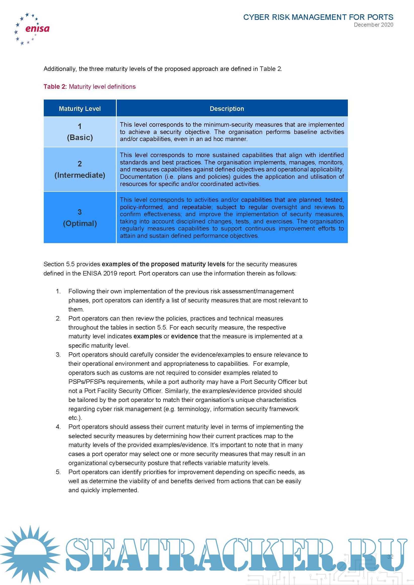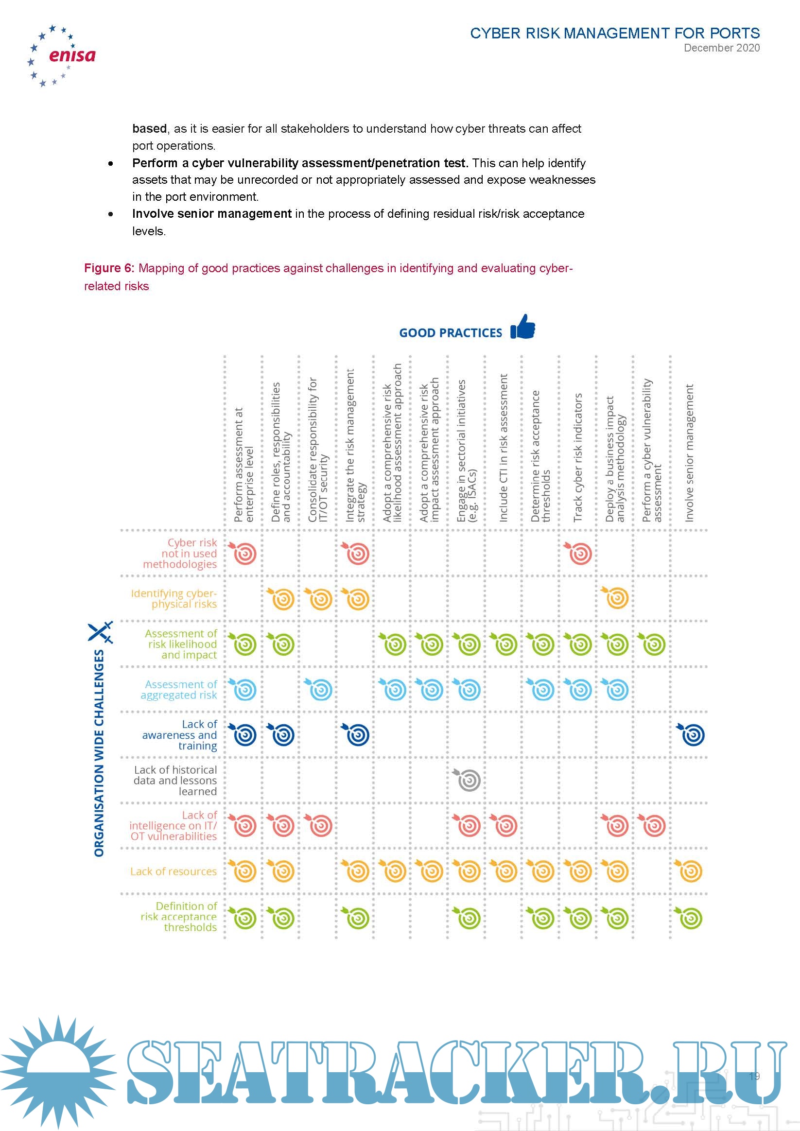 This report aims to provide port operators with good practices for cyber risk assessment that they can adapt to whatever risk assessment methodology they follow. In order to achieve this, this report introduces a four-phase approach to cyber risk management for port operators, which follows common risk management principles and is mapped to the steps of the risk assessment methodology that is laid out in the ISPS Code and relevant EU legislation for Port and Port Facility Security. For each of these phases, this report provides actionable guidelines to assist port operators in their efforts, lists common challenges associated with the performance of the relevant activities, good practices that can be readily adopted and customised by individual organisations and a mapping of the listed good practices for each phase with the respective challenges they address.