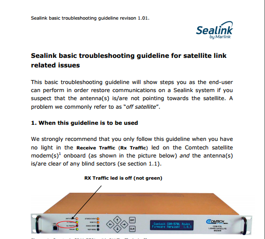 Description: This basic troubleshooting guideline will show steps you as the end-user can perform in order restore communications on a Sealink system if you suspect that the antenna(s) is/are not pointing towards the satellite. A problem we commonly refer to as “off satellite”.