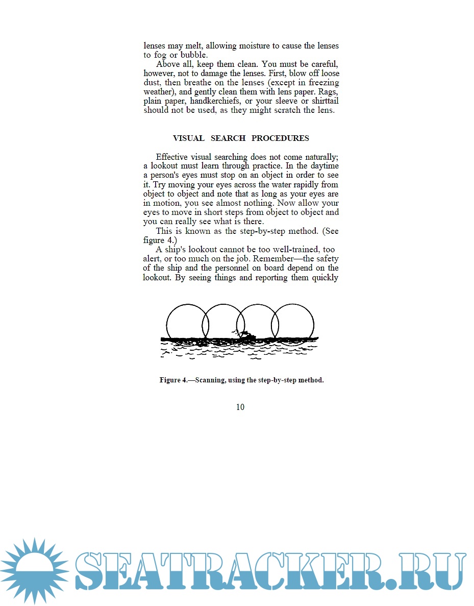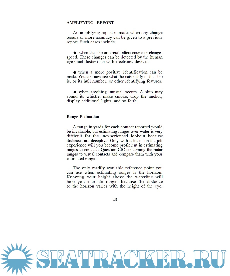 Description: This booklet is entirely dedicated to lookout training and procedures. A lookout is a person detailed to observe everything within an assigned sector and to report everything from that sector, usually to an officer of a military vessel. The safety and efficiency of the ship obviously depend to a great degree on the alertness and effectiveness of lookouts, and every vessel shall at all times maintain a proper look-out by all available means, as per rule 5. Even if written for the Navy, this guide is of interest for merchant and pleasure vessel, that may need to strengthen lookouts in poor visibility or close quarters conditions. This guide discusses and presents visual search patterns and contact reporting procedures; speed and track estimation; ship/aircraft recognition; Rules of the Road; buoy systems; special sea detail; restricted visibility steaming; and man-overboard procedures, along with lookout equipment you in your capacity as a lookout.