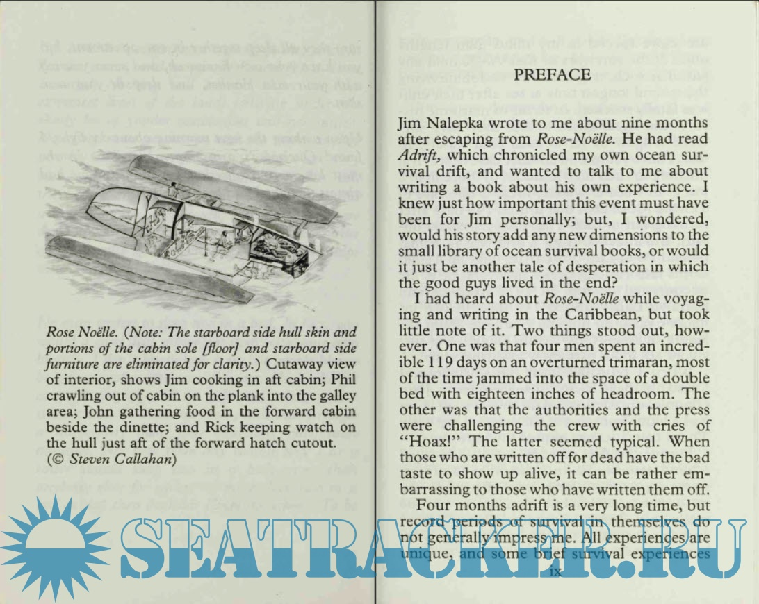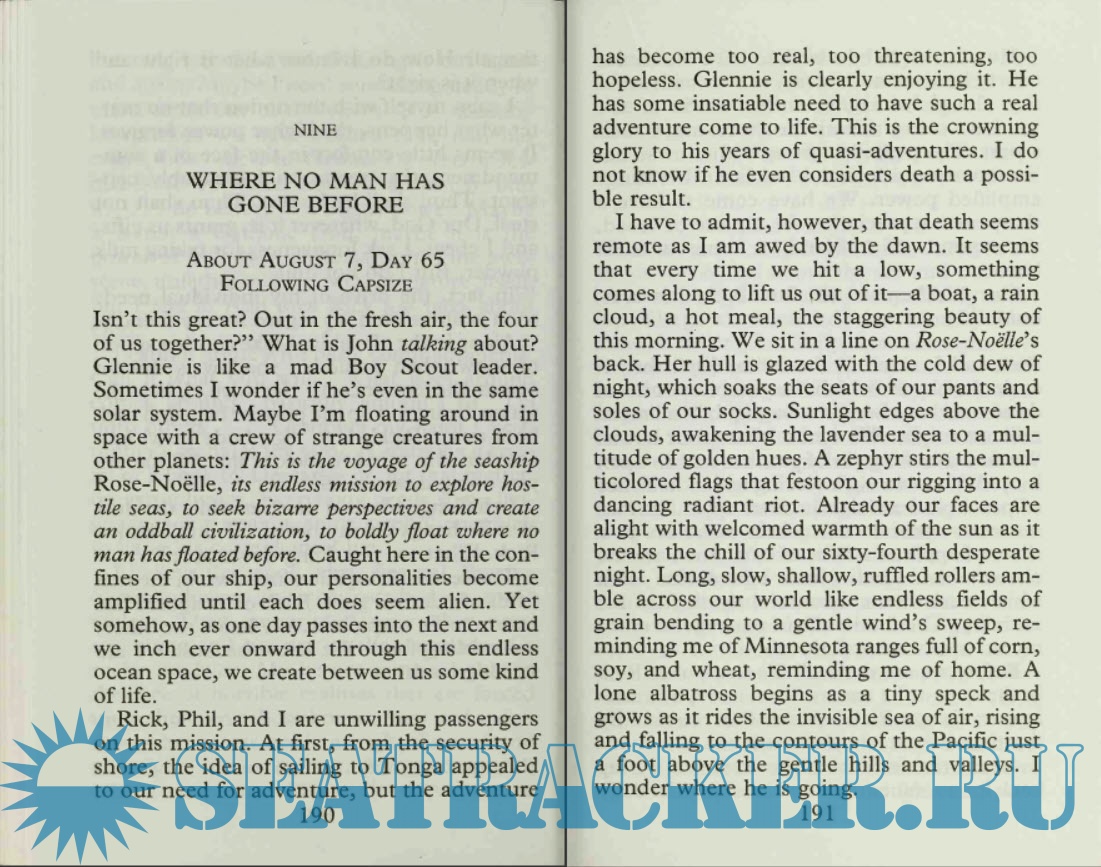 Nalepka, an American, along with three New Zealanders, survived 119 days adrift in the South Pacific on an overturned trimaran boat. In this account of the ordeal, Nalepka's focus is on the relationships that developed among them; both their dependencies upon one another and their conflicts. Sea survival stories are grueling, but they usually end happily with rescue. While the four men eventually make it to shore, the account goes on to describe an equally grueling account of the drawn-out death of a crewmember from a tumor months after reaching land. Skipper John Glennie has written a competing account of the ordeal, The Spirit of Rose-Noelle