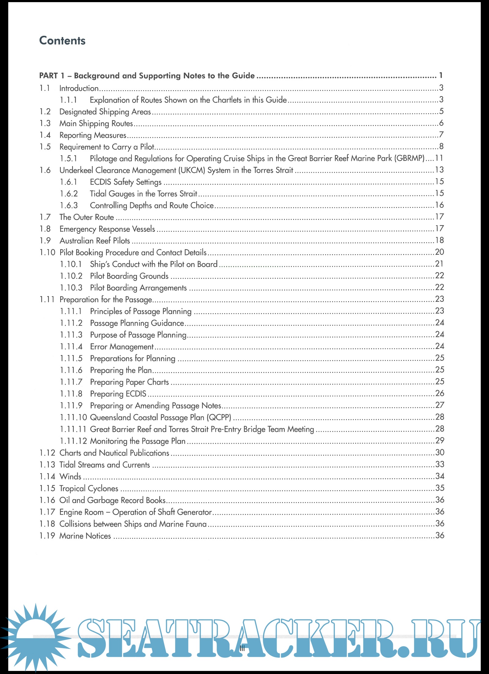 Year: 2019 Language: english Author: AMSA Genre: Guide Edition: 3 Format: PDF Quality: Scanned pages + text layer Pages count: 263 Description: The Great Barrier Reef is an area of global environmental and economic importance. As early as 1975, the Australian Government recognised its significance by creating the Great Barrier Reef Marine Park Authority (GBRMPA) to regulate all activities that take place within the marine park. Its scientific, cultural and historic importance led to the Park being added to the UNESCO World Heritage Site List in 1981, with the adjoining and connected Gondwana Tropical Rainforests added in 1986. The Park, and the adjoining area encompassing the Torres Strait up to the border with Papua New Guinea, was designated a Particularly Sensitive Sea Area (PSSA) in 1990, which led to the introduction of compulsory pilotage the following year. Consequently, passing through these areas can be a cause of concern for the mariner, particularly if the bridge team is unfamiliar with the region. Although the whole of the Torres Strait and Great Barrier Reef lies within the state of Queensland, regulation of activities within this area is covered by both state and federal legislation. The source information is not always easy to locate and interpret, particularly if the ship has not been able to obtain all the necessary documentation prior to departing the last port. This Guide contains the information the bridge team will need to properly prepare for the ship's transit through the area. All the data contained within this Guide has been collated and validated by Australian Reef Pilots, drawing on their considerable experience in all areas of the Marine Park. It is also their approved familiarisation and training guide. Australian Reef Pilots strongly recommend that this Guide is used, not only as part of the ship's pre-entry procedures, but also as a tool for familiarising and refreshing the bridge team each time the ship is planning a passage through the area. Its design, with pull-out chartlets, allows this Guide to be used in 'real time', giving the navigator the overview that can be lost with the introduction of ECDIS paperless ships. Additional info: