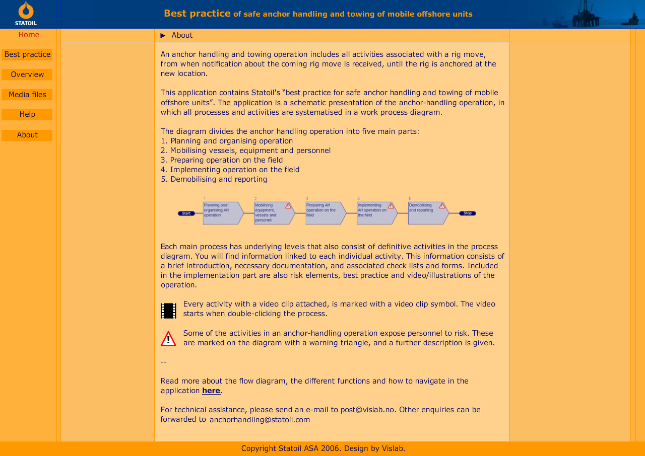 This application contains Statoil's "best practice for safe anchor handling and towing of mobile offshore units". The application is a schematic presentation of the anchor-handling operation, in which all processes and activities are systematised in a work process diagram.