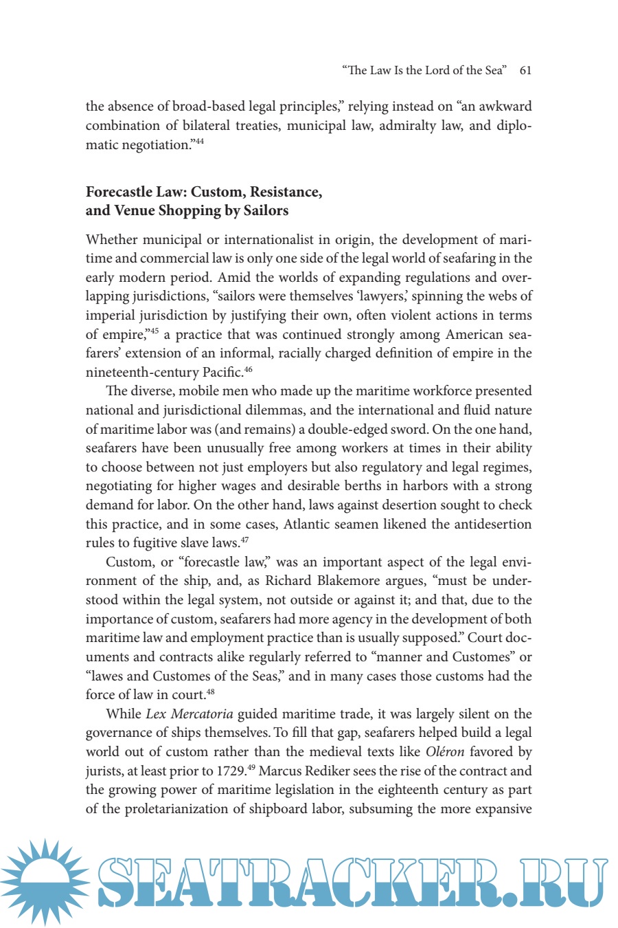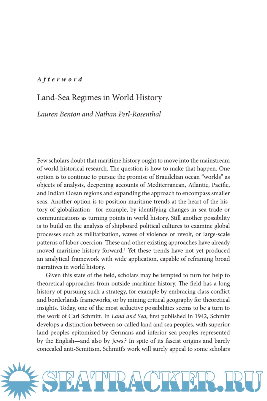 Year: 2020 Language: english Author: Benton L., Perl-Rosenthal N. Genre: History Publisher: University of Pennsylvania Press ISBN: 0812252411 Format: PDF Quality: Scanned pages Pages count: 280 Description: The past twenty-five years have brought a dramatic expansion of scholarship in maritime history, including new research on piracy, long-distance trade, and seafaring cultures. Yet maritime history still inhabits an isolated corner of world history, according to editors Lauren Benton and Nathan Perl-Rosenthal. Benton and Perl-Rosenthal urge historians to place the relationship between maritime and terrestrial processes at the center of the field and to analyze the links between global maritime practices and major transformations in world history. A World at Sea consists of nine original essays that sharpen and expand our understanding of practices and processes across the land-sea divide and the way they influenced global change. The first section highlights the regulatory order of the seas as shaped by strategies of land-based polities and their agents and by conflicts at sea. The second section studies documentary practices that aggregated and conveyed information about sea voyages and encounters, and it traces the wide-ranging impact of the explosion of new information about the maritime world. Probing the political symbolism of the land-sea divide as a threshold of power, the last section features essays that examine the relationship between littoral geographies and sociolegal practices spanning land and sea. Maritime history, the contributors show, matters because the oceans were key sites of experimentation, innovation, and disruption that reflected and sparked wide-ranging global change. Additional info: About the Author Lauren Benton is the Barton M. Biggs Professor of History and Professor of Law, Yale University. Nathan Perl-Rosenthal is Associate Professor of History, Spatial Sciences, and Law at the University of Southern California.