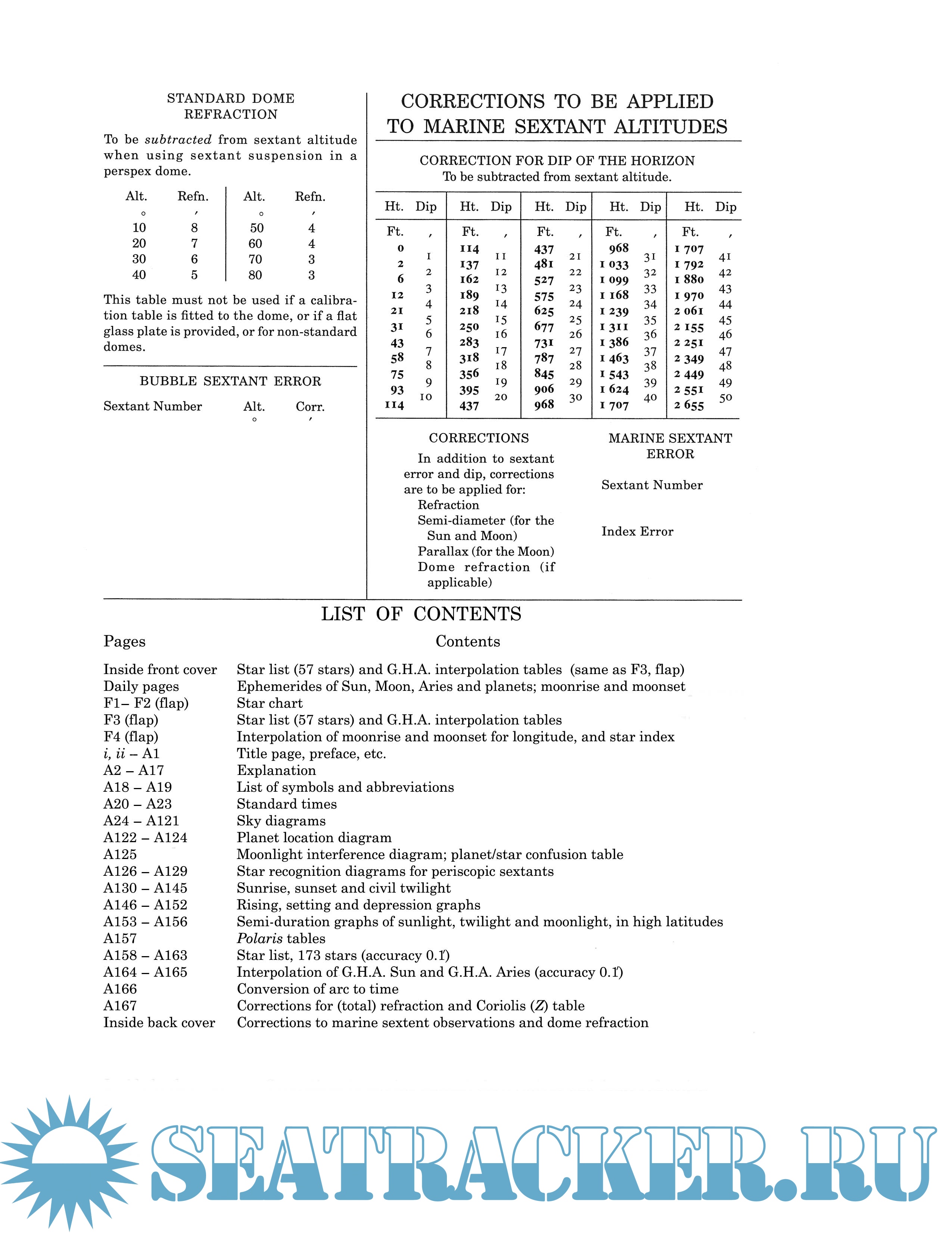 data for the Sun, Aries, planets and Moon. The data for the 57 stars in the standard list are given on both the inside front cover and on the flap for convenience in use with the daily pages. The remaining tables, diagrams and explanatory material are arranged, as far as possible, in order of importance backwards from the end of the volume. The list of contents is given on the inside back cover.
