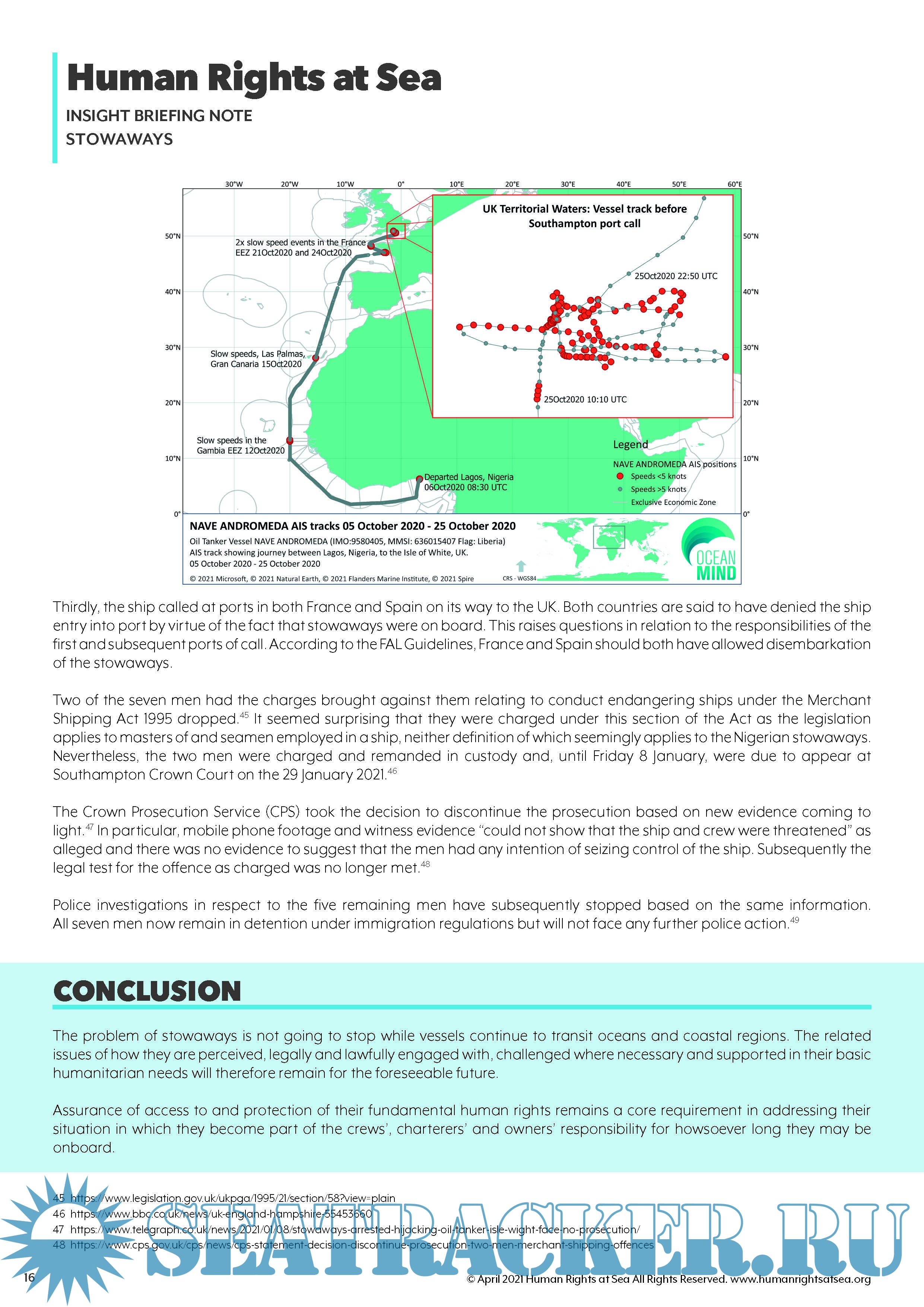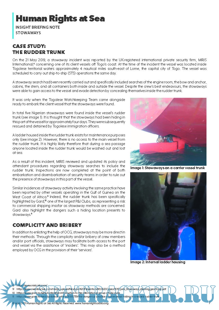 Year: 2021 Language: english Author: Human Rights at Sea Format: PDF Quality: eBook Pages count: 19 Description: Stowaways have been an expected, though unwanted feature of the maritime environment including within the shipping and fisheries industries since ships have travelled between countries and regions. The presence of stowaways on board commercial vessels, in particular, causes a plethora of legal, economic, and indeed political issues, the consequences of which come at cost in monetary and reputational terms to an array of interrelated industry stakeholders. These include owners, managers, insurers and the crew themselves. Yet, underlying these impacts lie human accounts behind the stowaways, each with its own set of unique human factors combining to impel the would-be stowaway to embark on such a perilous journey. This Insight Briefing Note aims to look at the broader issue of stowaways on commercial ships with a particular focus on the ‘push’ and ‘pull’ factors influencing the individuals’ decisions to resort to potential criminal means to achieve their ends. Included questionnaire has been prepared by North P&I to assist in establishing, principally, the true nationality of a stowaway who is without valid travel documentation and to facilitate issuance of a temporary travel document from his country of origin in order that the stowaway can be disembarked and repatriated. Every effort, therefore, should be made to obtain a truthful answer to each of the questions.