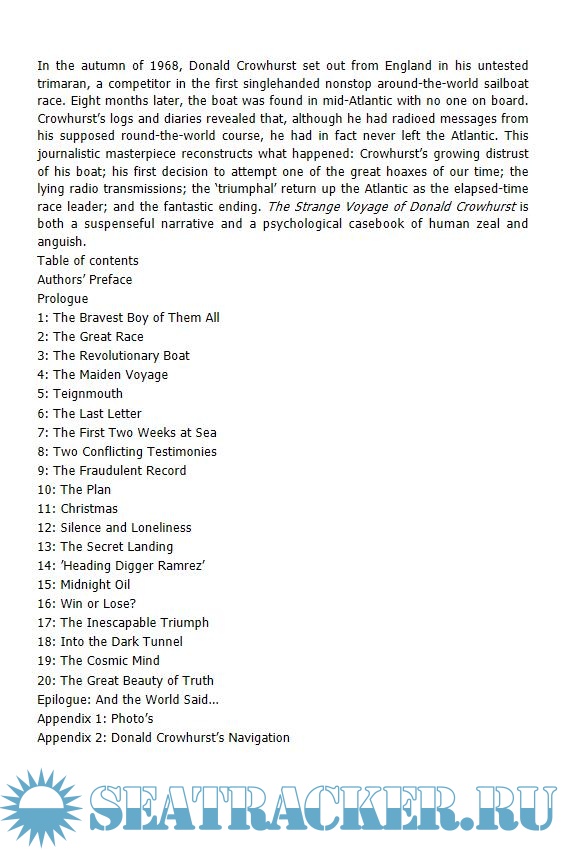 Year: 1969 Language: english Author: Tomalin N., Hall R. Genre: History Publisher: Côte d’Azur Format: EPUB Quality: eBook Pages count: 259 Description: The Sailor's Classics library introduces a new generation of readers to the best books ever written about small boats under sail In the autumn of 1968, Donald Crowhurst set sail from England to participate in the first single-handed nonstop around-the-world sailboat race. Eight months later, his boat was found in the mid-Atlantic, intact but with no one on board. In this gripping reconstruction, journalists Nicholas Tomalin and Ron Hall tell the story of Crowhurst's ill-fated voyage.