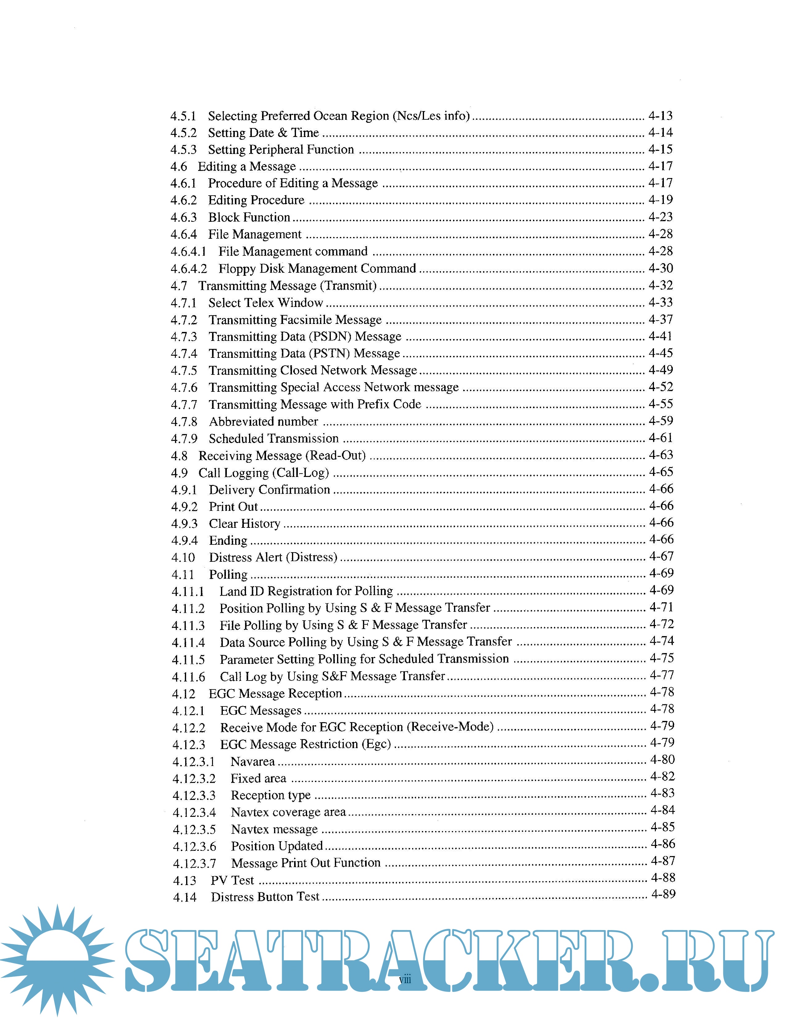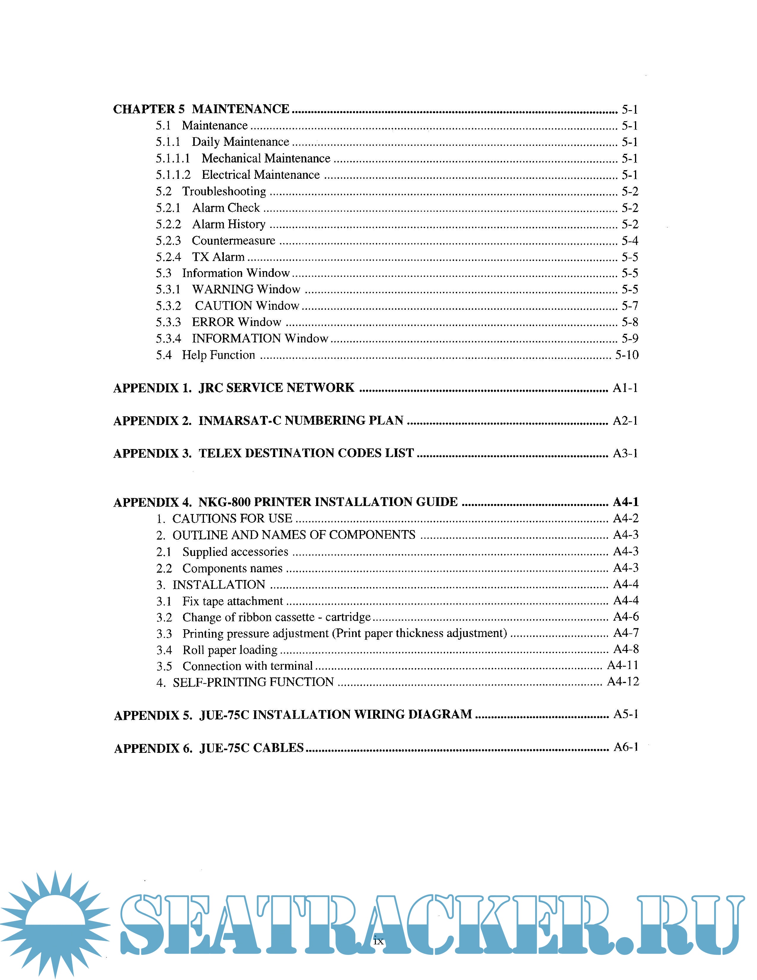 Year: 2003 Language: english Author: JRC Genre: Manual Publisher: JRC Edition: 02 Format: PDF Quality: Scanned pages Pages count: 168 Description: This manual covers the installation, operation and maintenance of the Mobile Earth Station (MES) JUE-75C for Inmarsat-C satellite communications. The Inmarsat-C satellite communications provides text and data transmission to and from Inmarsat-C MES and terrestrial subscribers via a variety of public networks. It also carries the Enhanced Group Call (EGC) message. • Function of JUE-75C JUE-75C provides the following functions; a) Store and Forward message transfer b) Distress Alert c) EGC message reception when not engaged in Inmarsat-C traffic (Inmarsat-C Class 2) d) Position and/or file transfer by a polling command from shore using store and forward message transfer e) Scheduled position and/or file transfer using store and forward message transfer f) Position and/or data reporting using data reporting protocol specified by Inmarsat (depends on LES facility)
