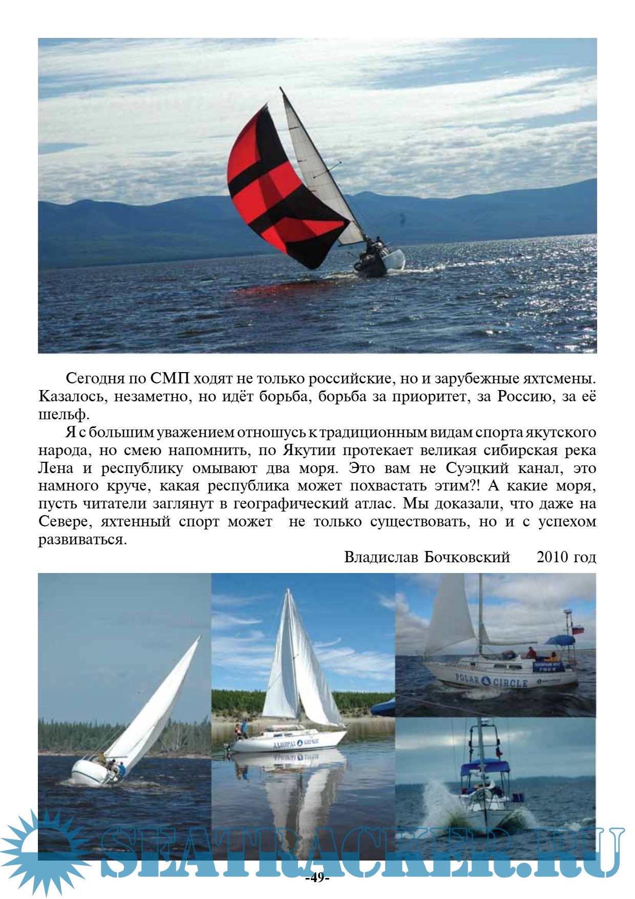 Доп. информация: Владислав Бочковский был известным яхтсменом, режиссёром и оператором более полусотни документальных фильмов. Одних материалов, использованных в передачах на центральных телевизионных каналах, таких как «Время», «Вести», «Клуб путешественников» и другие, подготовлено им более 500 штук. Участник и руководитель множества экстремальных экспедиций, парусных походов. Член Союза журналистов России, член Союза кинематографистов Якутии. На ТВ был автором и ведущим программ «По родной Якутии», «Клуб путешественников Якутии», «Служат наши земляки». Будучи корреспондентом Центрального телевидения снял и подготовил около 500 материалов показанных в программах «Время», «Вести», «Клуб путешественников» и др. Был дважды лауреатом премий журналистов Якутии «Золотое перо», лауреатом телефестивалей в г. Владивостоке, Магадане, Новосибирске, Петропавловске-Камчатском, Якутске за свои документальные фильмы, получил гран-при за вклад в кинолетопись Якутии, был удостоин звания «Почетный полярник», провел семь персональных фотовыставок, был даже начальником пресс службы Якутского казачьего полка, и конечно же он был Яхтенным капитаном.