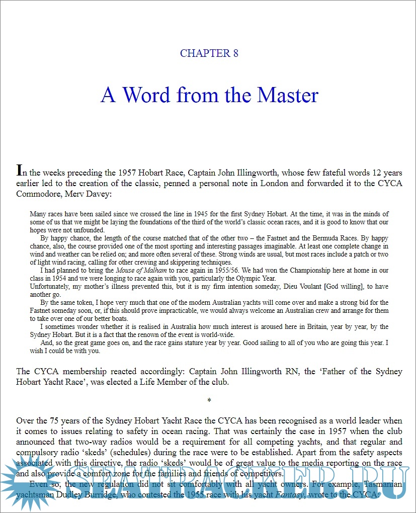 Description: Rob Mundle is a well known competitive sailor, journalist, media commentator, and author of eighteen books, including maritime history bestsellers. His book "Fatal Storm", on the tragic 54th Sydney Hobart Yacht Race was published in six languages. This book is the 76-years story, from the beginning to the present day, of the famous Sidney-Hobart, a 630 miles race that involves amateurs as well as professionals and sailing celebrities like John Illingworth, among others. It is also a story of yachting evolution, from wooden classics RORC anc CCA rules to carbon fibre supermaxis, and a test for boat building innovation.