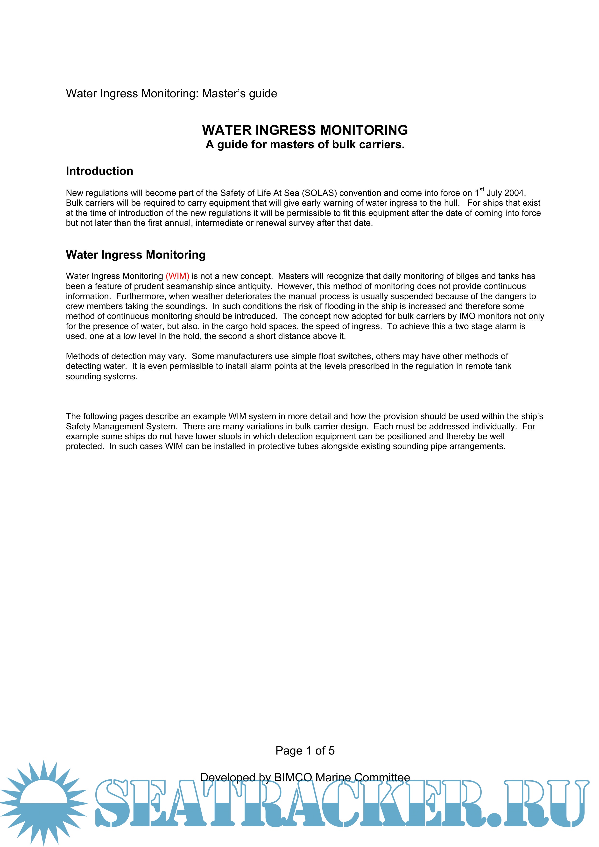 Year: 20xx Language: english Author: SIMCO Genre: Guide Format: PDF Quality: Unknown Pages count: >0 Description: Master's Guide for Water Ingress Monitoring Developed by SIMCO Marine Committee The regulations become part of the Safety of Life At Sea (SOLAS) convention and come into force on 1st July 2004. Bulk carriers will be required to carry equipment that will give early warning of water ingress to the hull. For ships that exist at the time of introduction of the new regulations it will be permissible to fit this equipment after the date of coming into force but not later than the first annual, intermediate or renewal survey after that date. Water Ingress Monitoring (WIM) is not a new concept. Masters will recognize that daily monitoring of bilges and tanks has been a feature of prudent seamanship since antiquity. The following pages describe an example WIM system in more detail and how the provision should be used within the ship's Safety Management System. There are many variations in bulk carrier design. Each must be addressed individually. For example some ships do not have lower stools in which detection equipment can be positioned and thereby be well protected. In such cases WIM can be installed in protective tubes alongside existing sounding pipe arrangements.