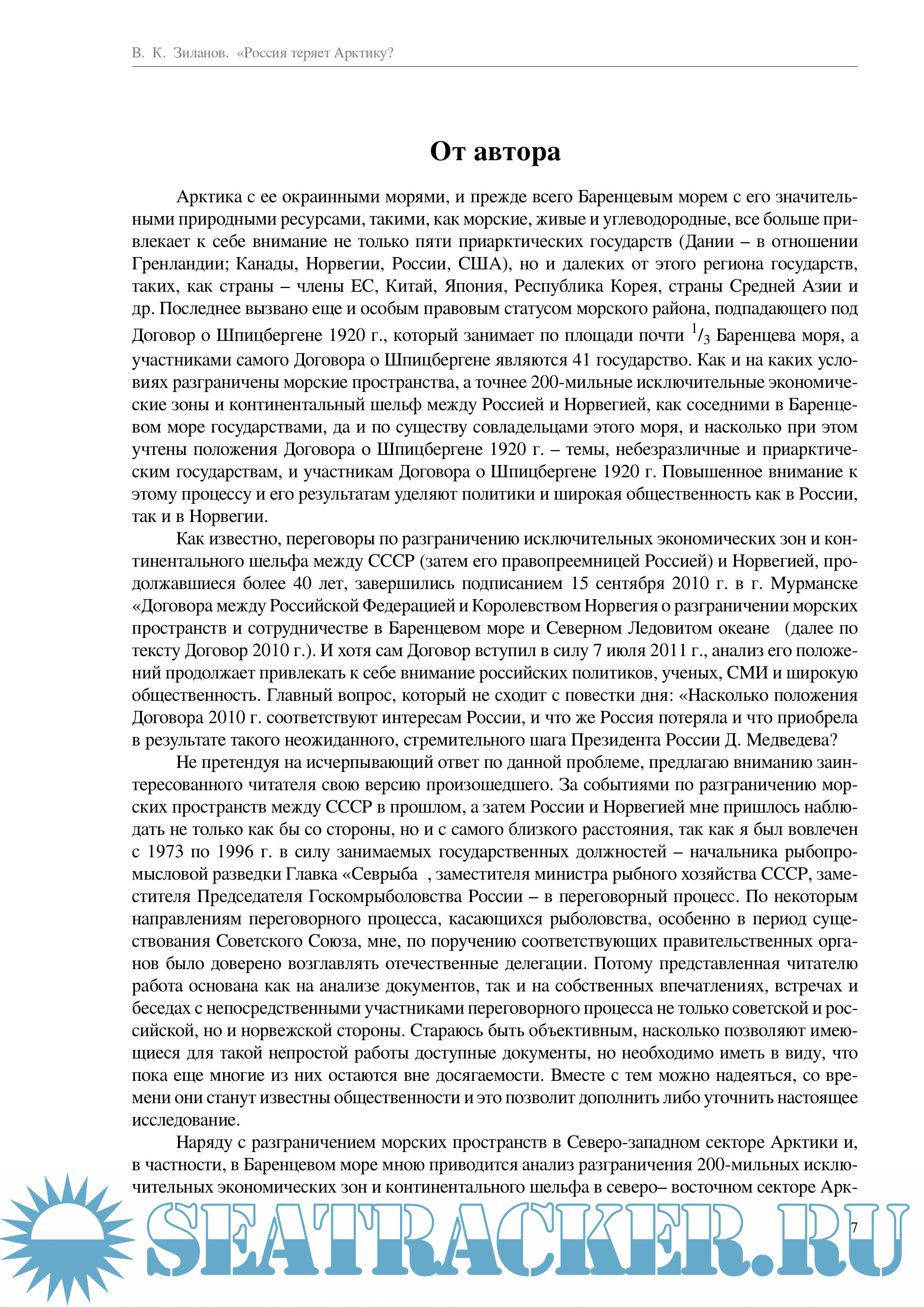 Автор – В. Зиланов – один из известнейших не только в России, но и за рубежом экспертов по морскому международному рыболовству, сотрудничеству в этой области, а также по проблемам оптимального использования ресурсов Мирового океана, включая район Арктики.