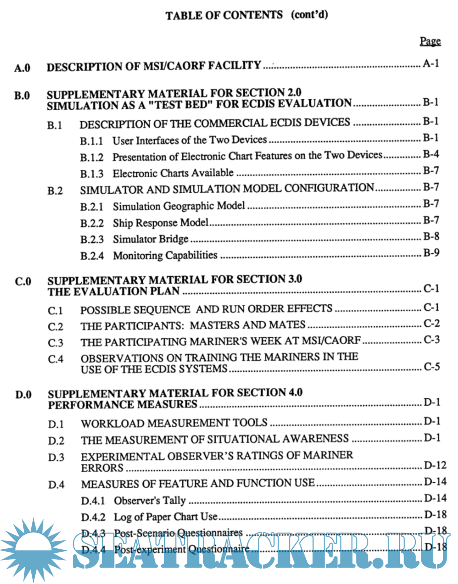 Year: 1995 Language: english Author: M.W. Smith et alli Genre: Research papers Publisher: U.S. Department of Transportation United States Coast Guard Office of Engineering, Logistics, and Development Format: PDF Quality: Unknown Pages count: 199 Description: This report describes a study done to examine the contributions that ECDIS might make to the operational practices on the commercial bridge. Issues examined were: the contribution to the safety of navigation, the effect on the navigational workload, the features required during route monitoring, and the potential contribution of integration with radar. Two commercially-available ECDIS devices were installed on the simulator bridge at MSI/CAORF. Expert mariners made repeated port arrivals and departures. A variety of ship and mariner performance measures were collected and extensive debriefings were conducted. ECDIS demonstrated the potential to increase safety, primarily by decreasing the cross track distance from a planned track, and the potential to decrease the workload of route monitoring, primarily by replacing time-consuming plotting on the paper chart. For route monitoring, mariners required only a simple display outlining safe water, but recommended access to a larger set of chart features as reference. Radar integration, as implemented on the devices used, did not provide the ARPA information mariners required.
