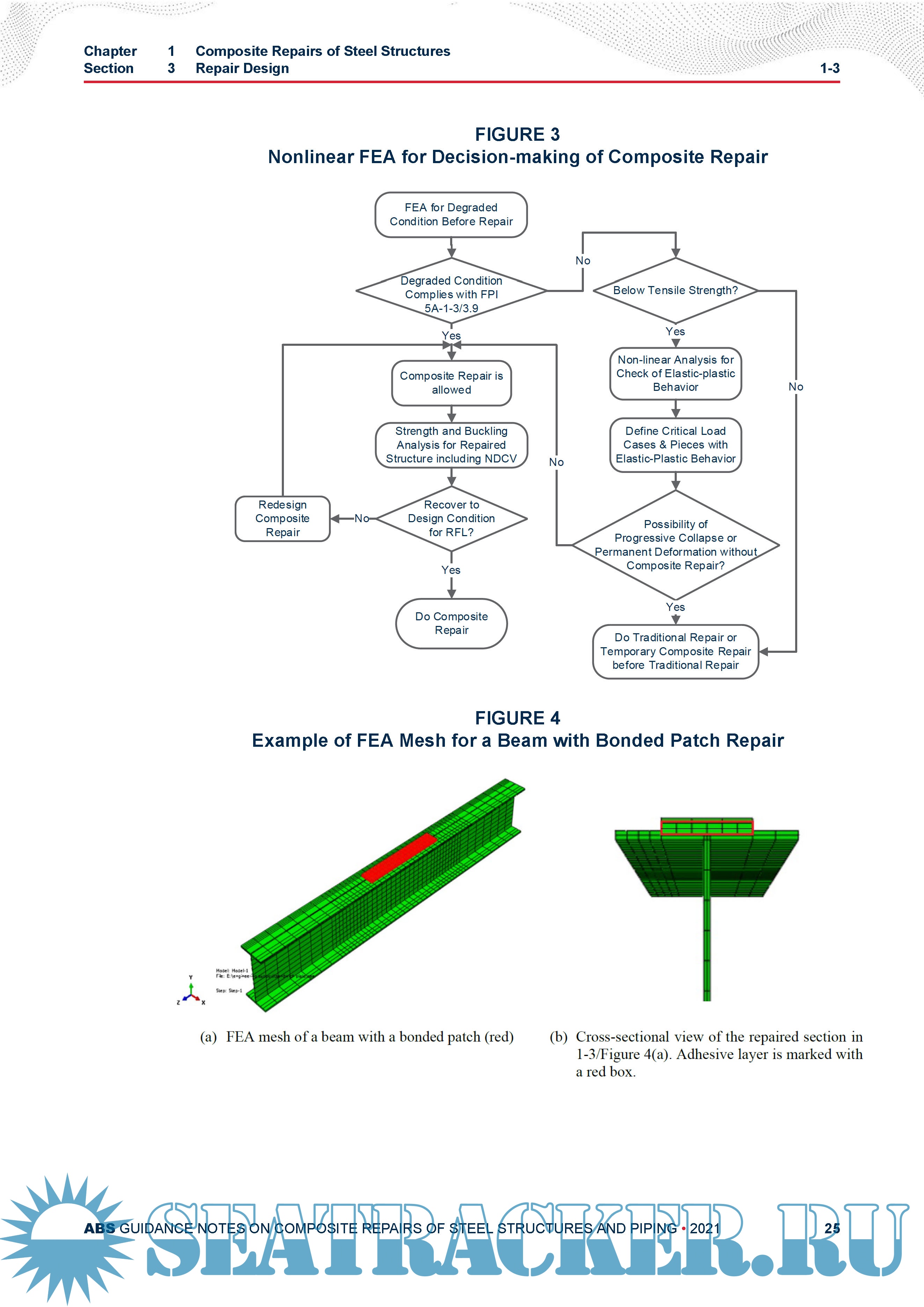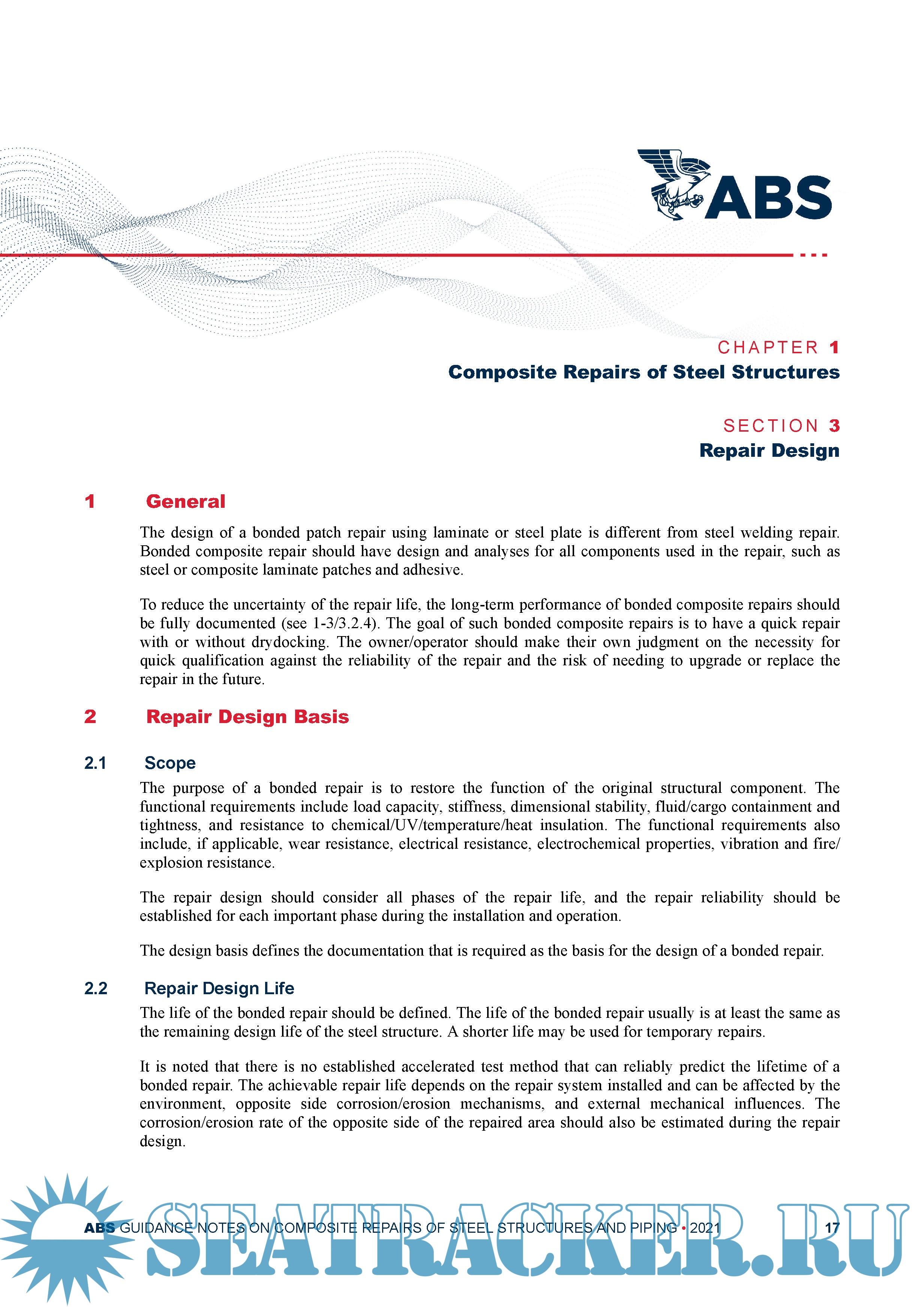 Year: 2021 Language: english Author: ABS Genre: Guide Format: PDF Quality: eBook Pages count: 71 Description: This Chapter is applicable to the use of composite repairs on site-specific offshore units such as FPSOs and FSOs. It provides guidelines on adhesively bonded composite repairs of the steel structures. It covers assessment, design, qualification, installation and inspection of a bonded repair. This Chapter does not cover aluminum structures, even though this guidance may also be applicable to aluminum structure repairs. These Guidance Notes provide an alternative to regular hot work renewal, where the hot work is considered risky to the offshore unit´s operation. Instead of using hot welding, an existing degraded steel structure can be repaired to restore the integrity of the structure by utilizing patches of composite material, steel plates, or other structural materials that are bonded to the degraded steel structure. Release Date: August, 2021