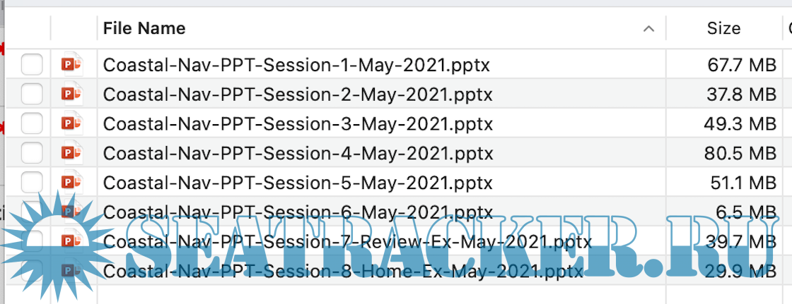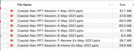 Contains PowerPoint (PPTX) files for eight, three-hour class sessions following the Coastal Navigation course book.
