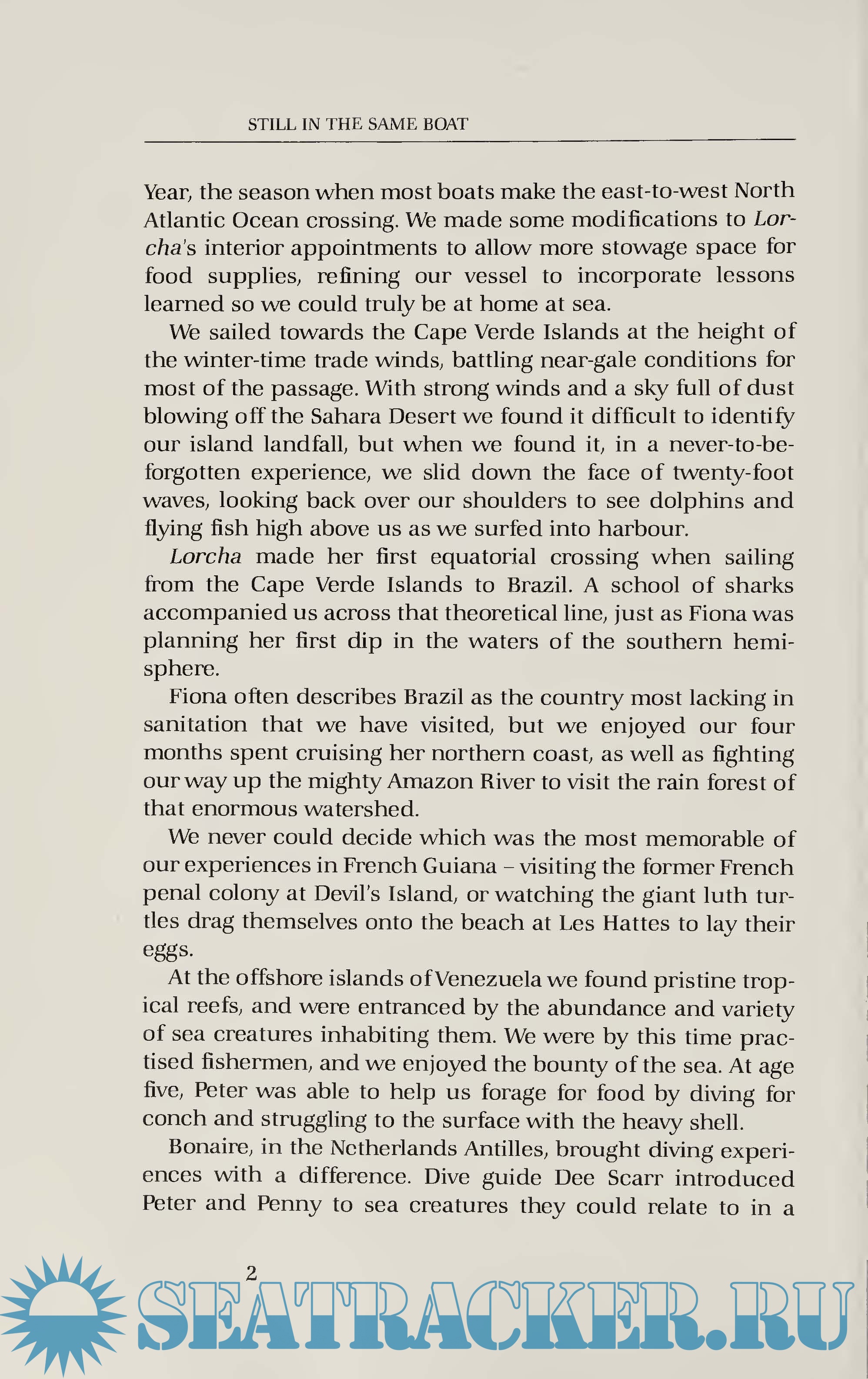 Year: 1990 Language: english Author: Fiona & Paul Howard McCall Genre: History Publisher: McClelland & Stewart Inc. Edition: First ISBN: 0-7710-5440-8 Format: PDF & EPUB Quality: Scanned pages Pages count: 382 Description: A Sailing Adventure. Book has Map endpapers and photographs. A Sailor's Dream Cruise: How a Canadian family (including they young children) built a boat in their backyard and sailed to Africa, South America and Panama on their way around the world. Thousands of readers were enchanted with the tale told in All in the Same Boat of a family of four who gave up everything that seems "normal” to a landlubber and sailed off in Lorcha, a nine-metre home-finished yacht with the red sails of a Chinese junk, to circumnavigate the world. Almost two years later, they had seen only the countries of the Atlantic Ocean. When we left Paul Howard, Fiona McCall, and their children Penny and Peter at the end of that book, they were moored at Panama and had just jointly made a momentous decision - to extend their unorthodox lifestyle by several more years. They were about to traverse the Canal and venture onto the Pacific Ocean with all its varied perils and delights. Once through the Canal it was on to Galapagos. Having made the acquaintance of an expatriate Canadian tour guide and her family, that treasure-trove was opened before them. The two families sailed from island to island making friends with iguanas and booby birds, learning of the area's geology, and swimming with the friendly sea lions. After Galapagos the paradise of the South Pacific lay before the family in the form of the thousands of tropical islands that sprinkle this ocean. They began with Pitcairn Island, famous as the refuge of the mutineers from the Bounty and home today to the descendants of those mutineers. Pitcairn's anchorage is an uncertain one and few ships stop there, but Paul, Fiona, and the children spent a few days among friendly people with a most singular culture. The children attended the island's school, but the day came when the winds almost forced Paul and Fiona to leave the children while they sailed away to weather the gale. Additional info: PDF & EPUB