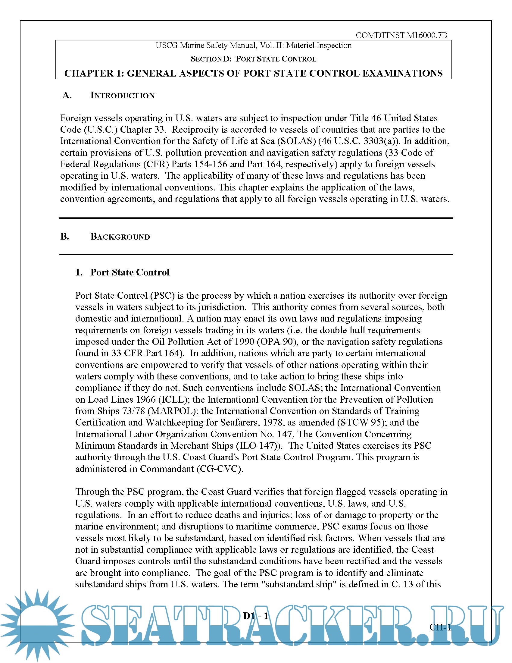 Description: Foreign vessels operating in U.S. waters are subject to inspection under Title 46 United States Code (U.S.C.) Chapter 33. Reciprocity is accorded to vessels of countries that are parties to the International Convention for the Safety of Life at Sea (SOLAS) (46 U.S.C. 3303(a)). In addition, certain provisions of U.S. pollution prevention and navigation safety regulations (33 Code of Federal Regulations (CFR) Parts 154-156 and Part 164, respectively) apply to foreign vessels operating in U.S. waters. The applicability of many of these laws and regulations has been modified by international conventions.