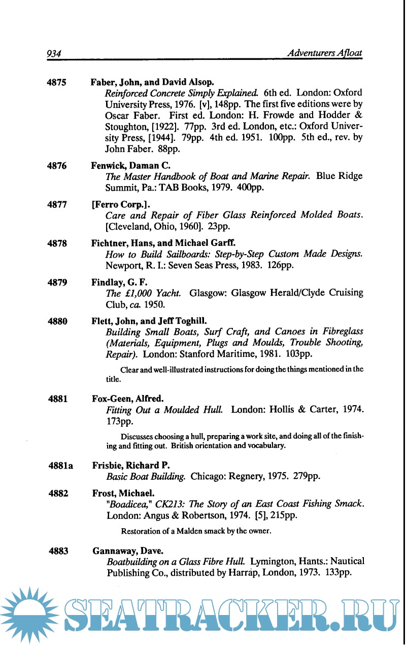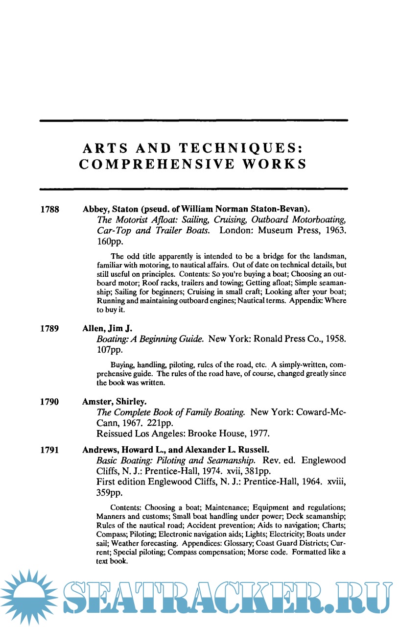 Description: A Comprehensive Guide to Books in English Recounting the Adventures of Amateur Sailors upon the Waters of the World in Yachts, Boats and Other Devices and Including Works on the Arts and Sciences of Cruising, Racing, Seamanship, Navigation, Design, Building, etc. from the Earliest Writings Through 1986." If you have any interest in such matters, and in collecting books about same, this is the reference you must have."