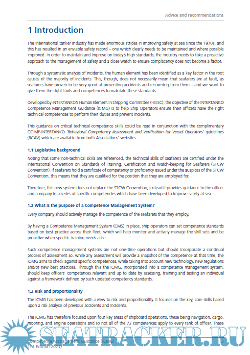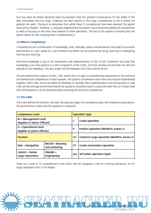 Year: 2021 Language: english Author: INTERTANKO Genre: Guide Format: PDF Quality: eBook Pages count: 152 Description: Developed by INTERTANKO’s Human Element in Shipping Committee (HEiSC), the objective of the INTERTANKO Competence Management Guidance (ICMG) is to help Ship Operators ensure their officers have the right technical competences to perform their duties and prevent incidents. This guidance on critical technical competence skills could be read in conjunction with the complimentary OCIMF-INTERTANKO ‘Behavioral Competency Assessment and Verification for Vessel Operators’ guidelines (BCAV) which are available from both Associations’ websites.