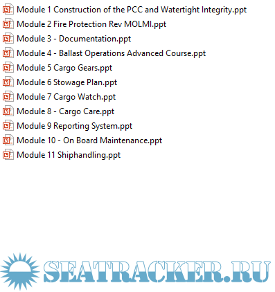 Description: Adance training course for deck officers employed on car carriers (PCC), prepared by MOL. Used for training of the Company's seafarers, but will be same useful for any officers working or planning to work onboard of PCC.Made as PPT presentatons.