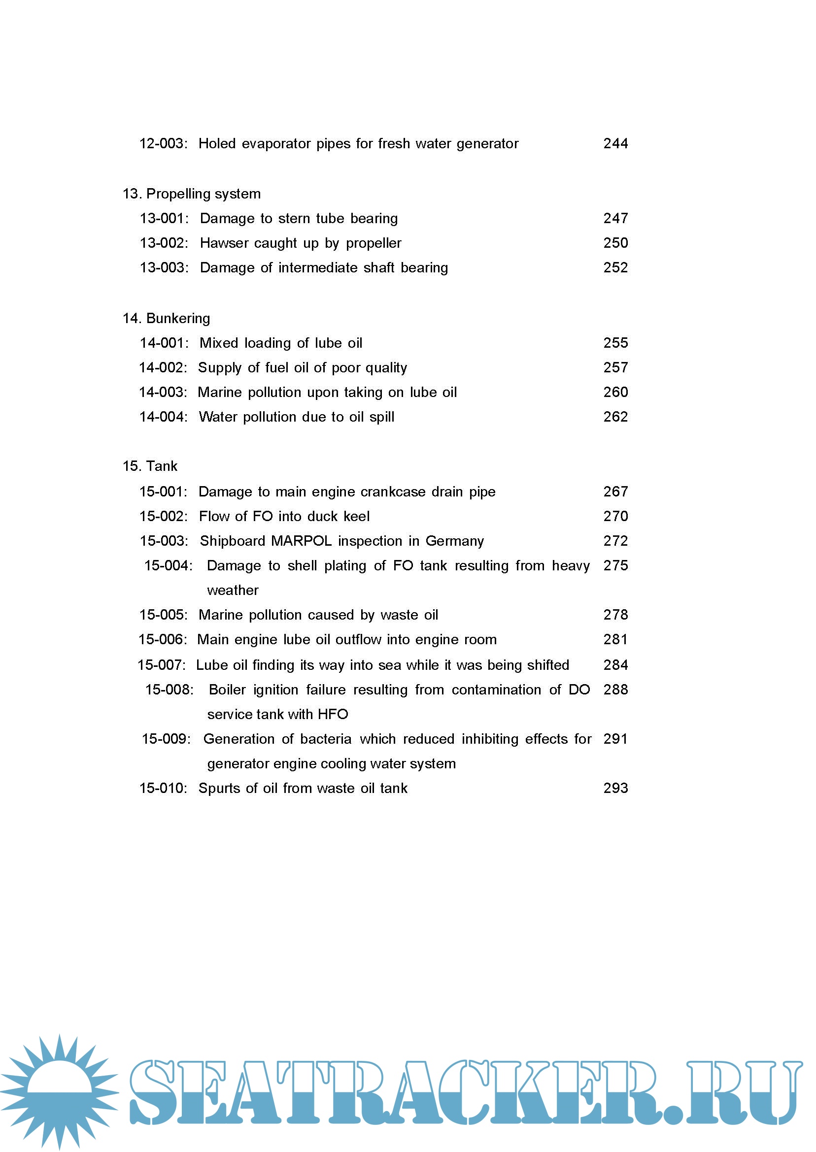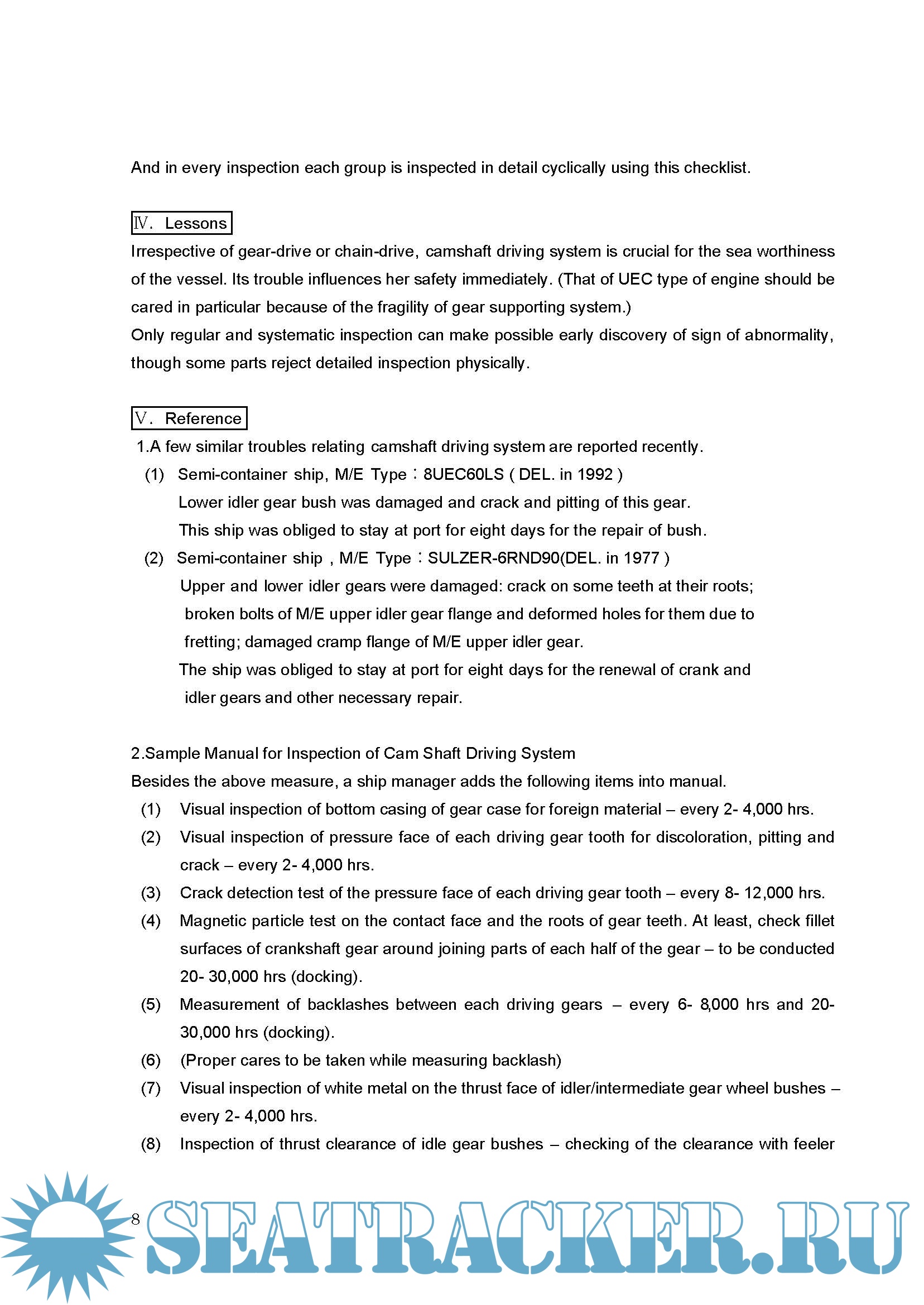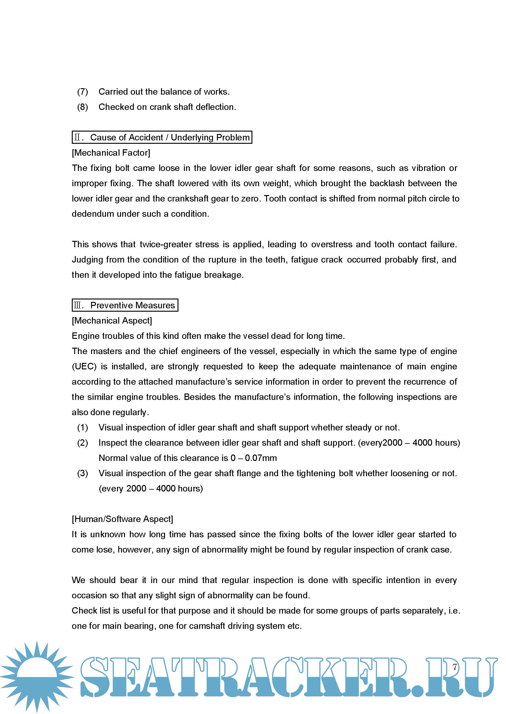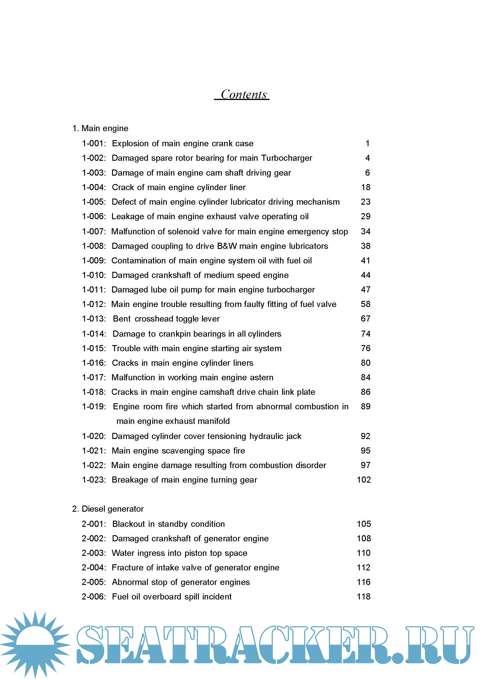 The causes of engine accidents are varied, but statistics of engine damage show that structural defects, and problems with design or workmanship, largely account for such accidents. We do not encounter, with a high frequency, cases where the mishandling of equipment and instruments on the part of crew members directly contributed to accidents. There is also a tendency for similar accidents to occur on board many vessels with similar specifications.