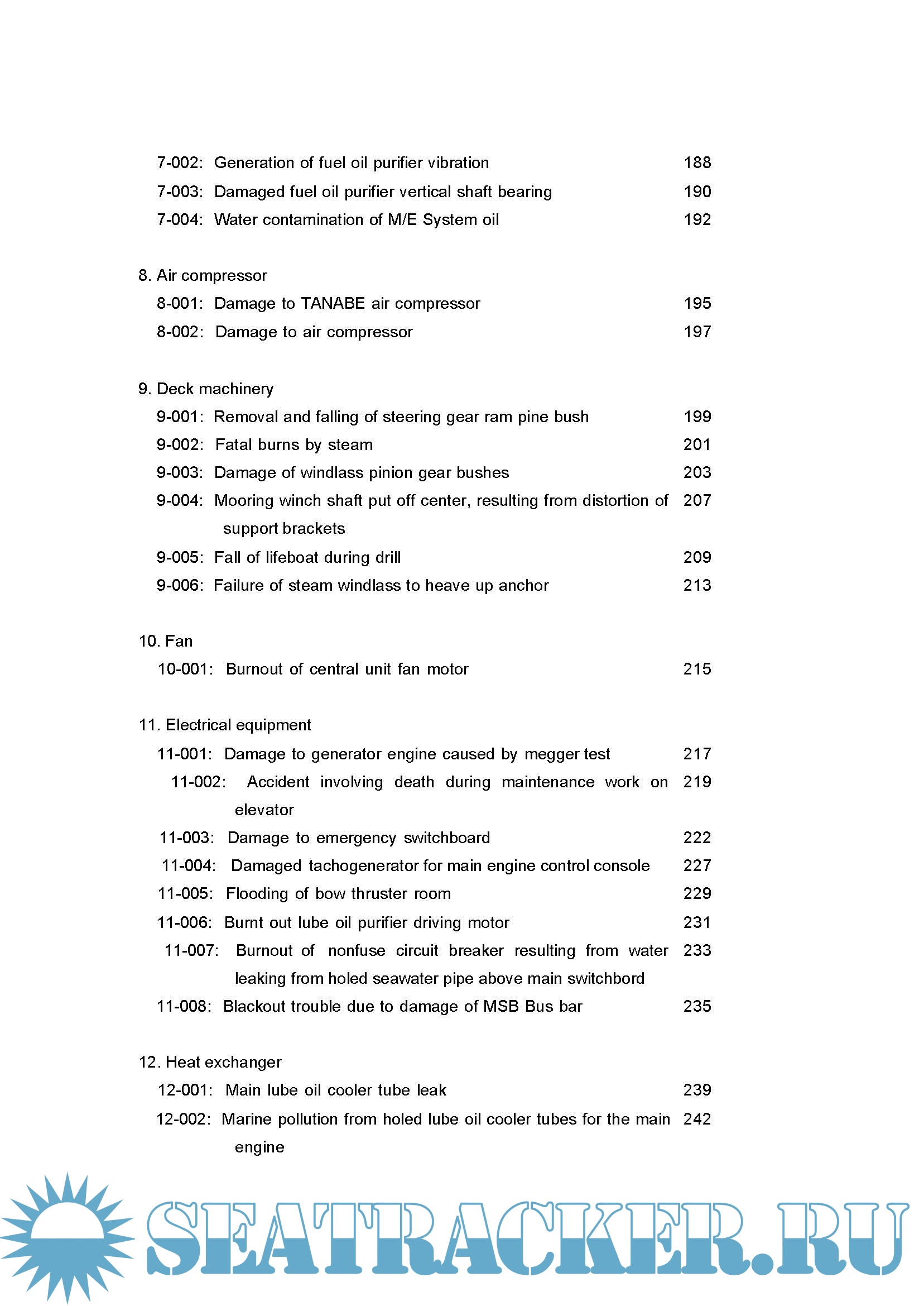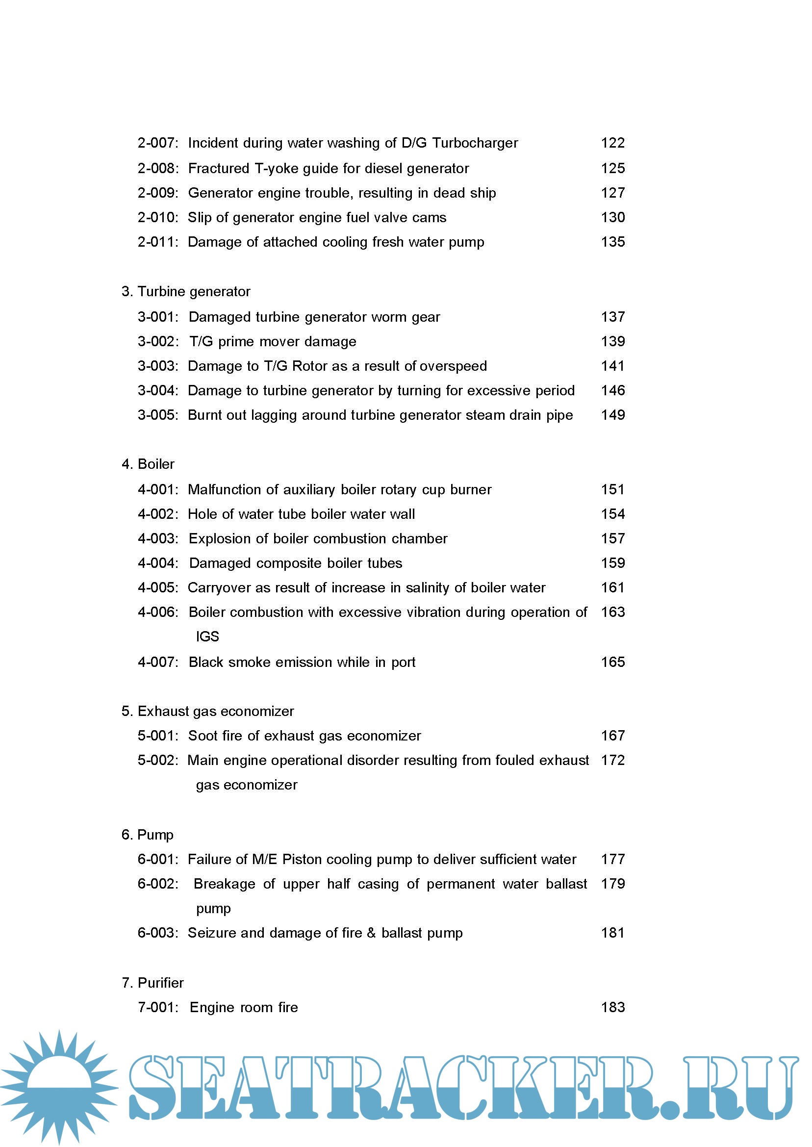 In order to realize that various phenomena (e.g., temperature, sound, pressure, leak, discoloration) which appear in equipment and instruments are signs which may precede subsequent accidents, experience as a professional is naturally required. However, in reality, there is a limit to the experience one engineer can have in the performance of his duties on board vessels. It is, therefore, important to sufficiently analyze accidents which have occurred on board other vessels and utilize such analyses as lessons to prevent accidents of similar kinds.