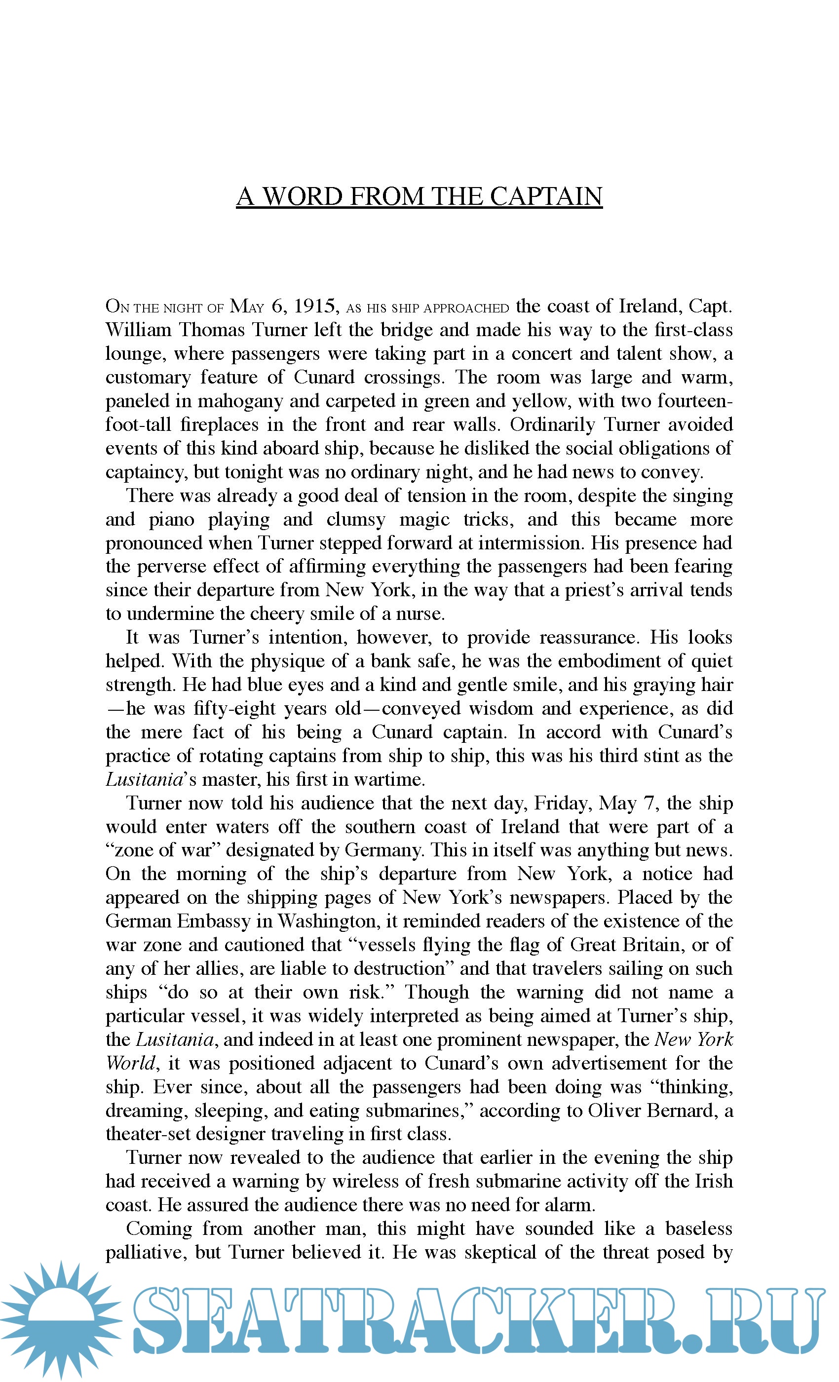 Description: On May 1, 1915, with WWI entering its tenth month, a luxury ocean liner as richly appointed as an English country house sailed out of New York, bound for Liverpool, carrying a record number of children and infants. The passengers were surprisingly at ease, even though Germany had declared the seas around Britain to be a war zone. For months, German U-boats had brought terror to the North Atlantic. But the Lusitania was one of the era’s great transatlantic “Greyhounds”—the fastest liner then in service—and her captain, William Thomas Turner, placed tremendous faith in the gentlemanly strictures of warfare that for a century had kept civilian ships safe from attack.