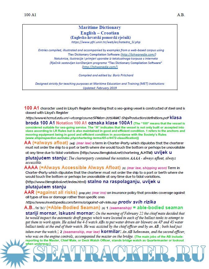 Year: 2019 Language: English, Croatian Author: Boris Pritchard Genre: Dictionary Format: PDF Quality: eBook Pages count: 1702 Description: This dictionary is updated at frequent intervals. The majority of the information presented in the dictionary has been compiled from various web-based sources or through personal experience. Grateful acknowledgement is made to the website sources, primarily a series of maritime glossaries and dictionaries, which are shown in italics in the definitions. Similar references are also made to web-based sources contributing or making part of usage examples. The same also holds for term illustrations which can be traced on the web. Every effort has been made to contact copyright holders and obtain permission for occasional use of their respective resources. If any have been inadvertently overlooked or mispresented the author will be pleased to make the necessary amendments at the first opportunity.