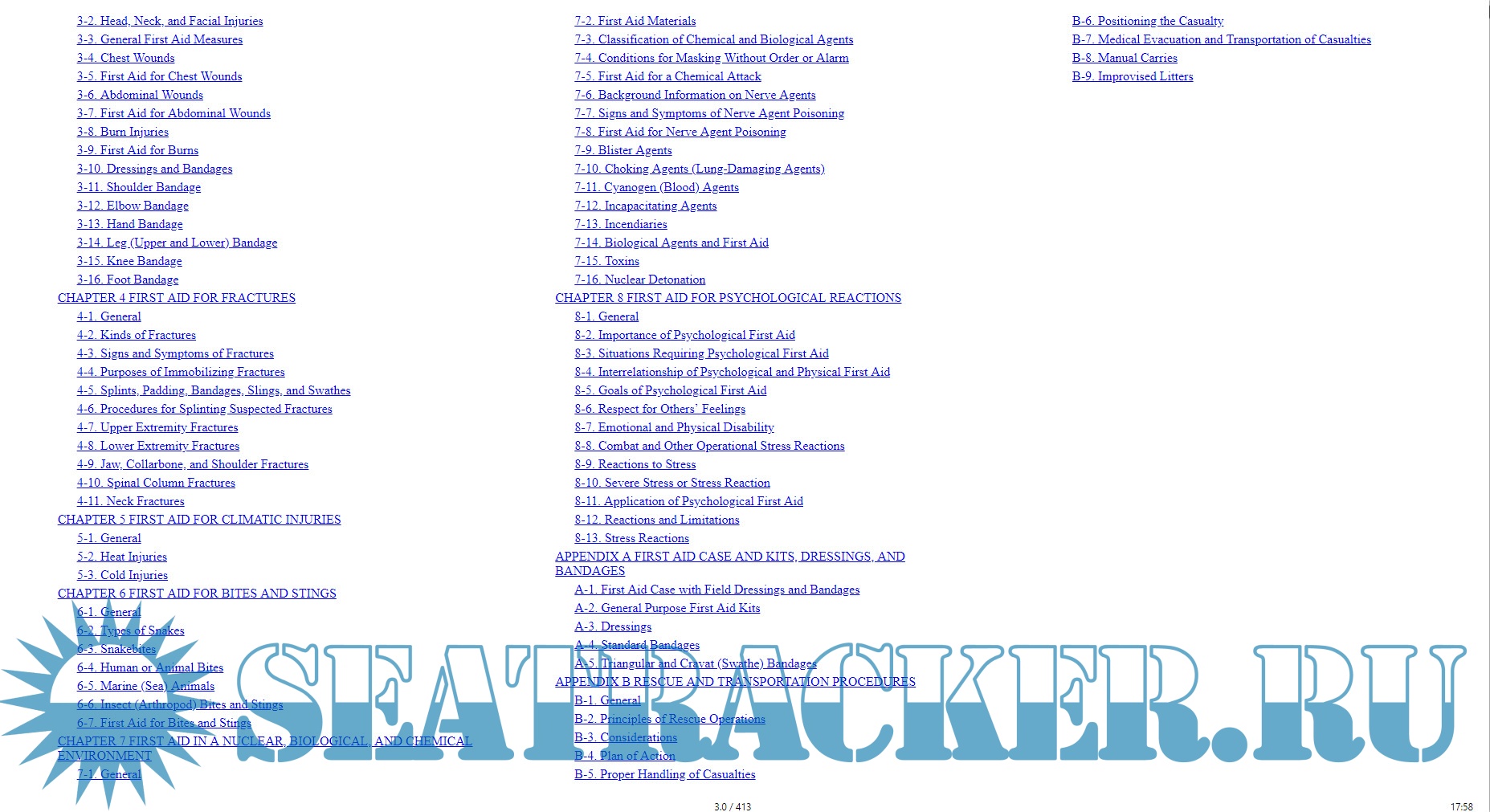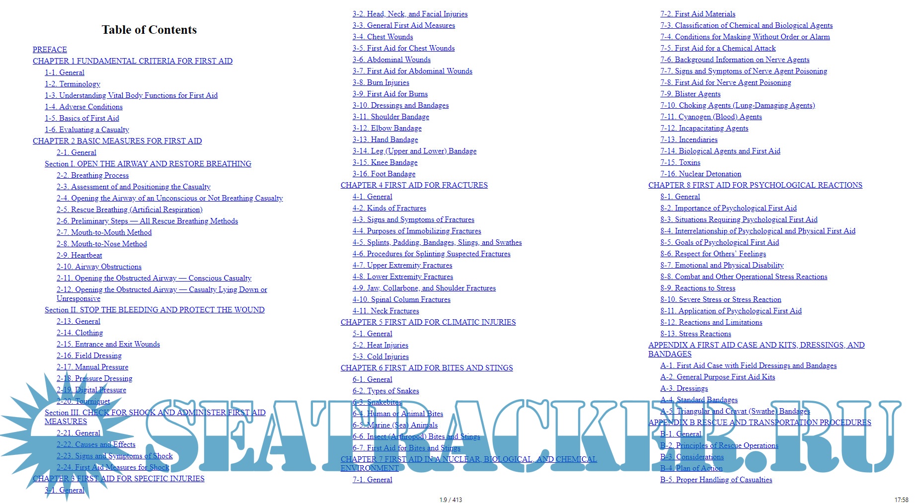 Year: 2017 Language: english Author: Department of the Army, Navy and Air Force USA Genre: Manual Publisher: Madison and Adams Press ISBN: 978-80-268-7724-0 Format: EPUB Quality: eBook Pages count: 413 Description: Learn the fundamental and basic measures for providing help to the injured: Treat fractures, climatic injuries, bites and stings (With 100+ Explantory images).