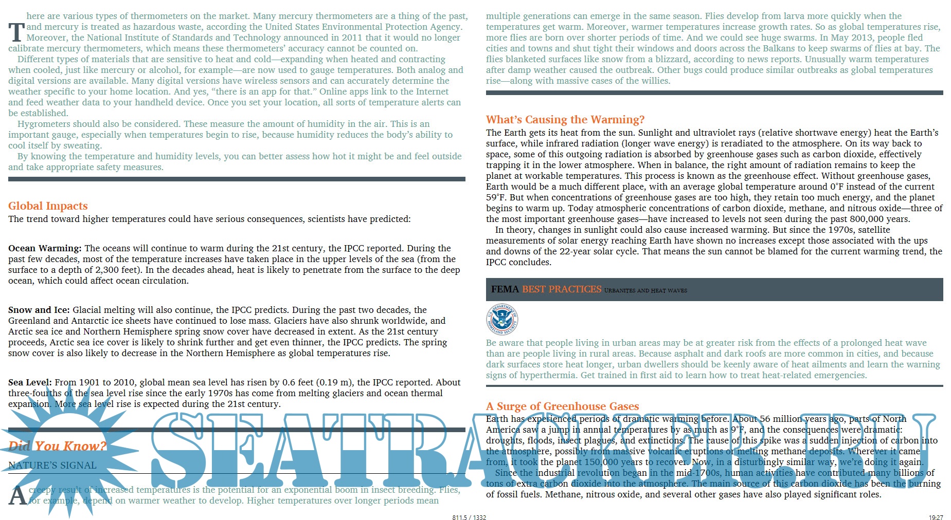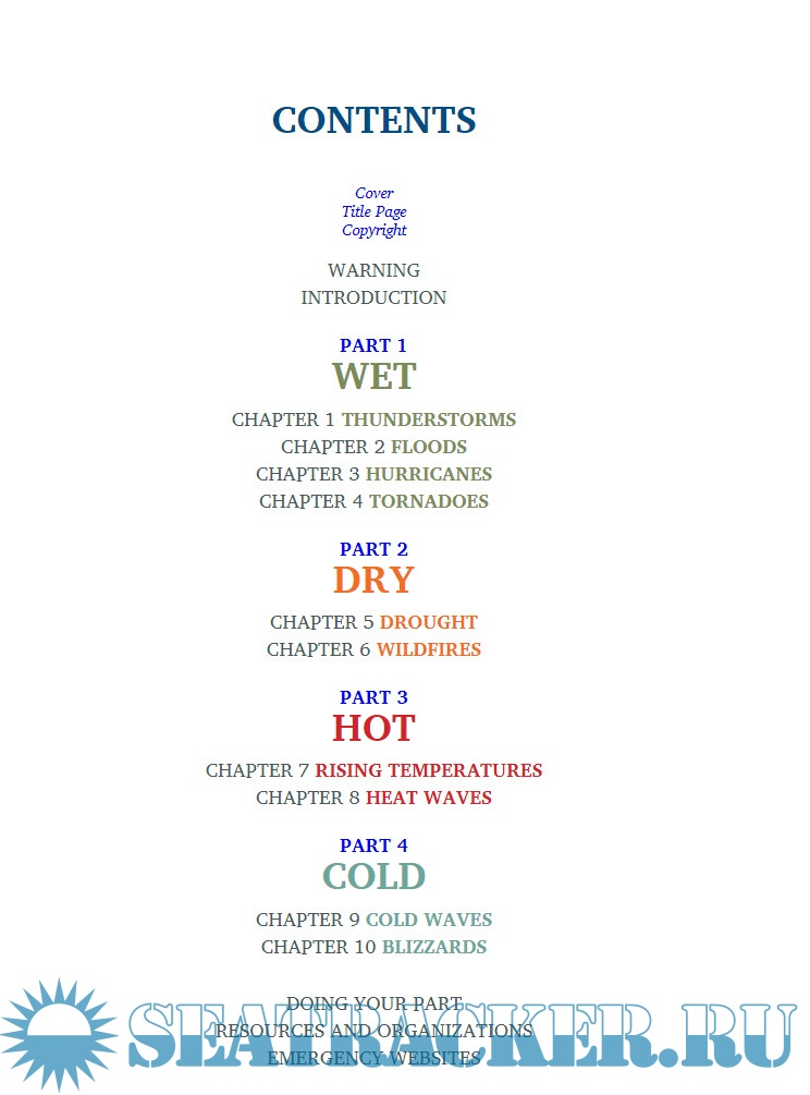 Description: Hurricanes, floods, wildfires, tornadoes-weather is becoming extreme, and this book tells you how to plan ahead and prepare, respond to emergencies, and survive the worst-case scenarios. From the risks of building on changing coastlines to the safety kit you should have packed up at home, from the telltale signs of a hurricane on the horizon to how to power up when the grid goes down-this will be the one book to carry with you through all kinds of bad weather. Divided into four sections (Hot, Cold, Wet, Dry) each chapter includes a level-headed discussion of current weather extremes, facts and details on conditions, and theories for why these changes are occurring; dos and don'ts for inside and outside; and gives at-a-glance guidance for how to prepare for, survive, and recover from every extreme. Sidebar features include: gears and gadgets; protecting your pet; and firsthand accounts from survivors and the experts who help them. Spectacular photographs of wicked weather plus useful checklists and how-to illustrations make page after page both useful and entertaining, even when you're contemplating the unthinkable.