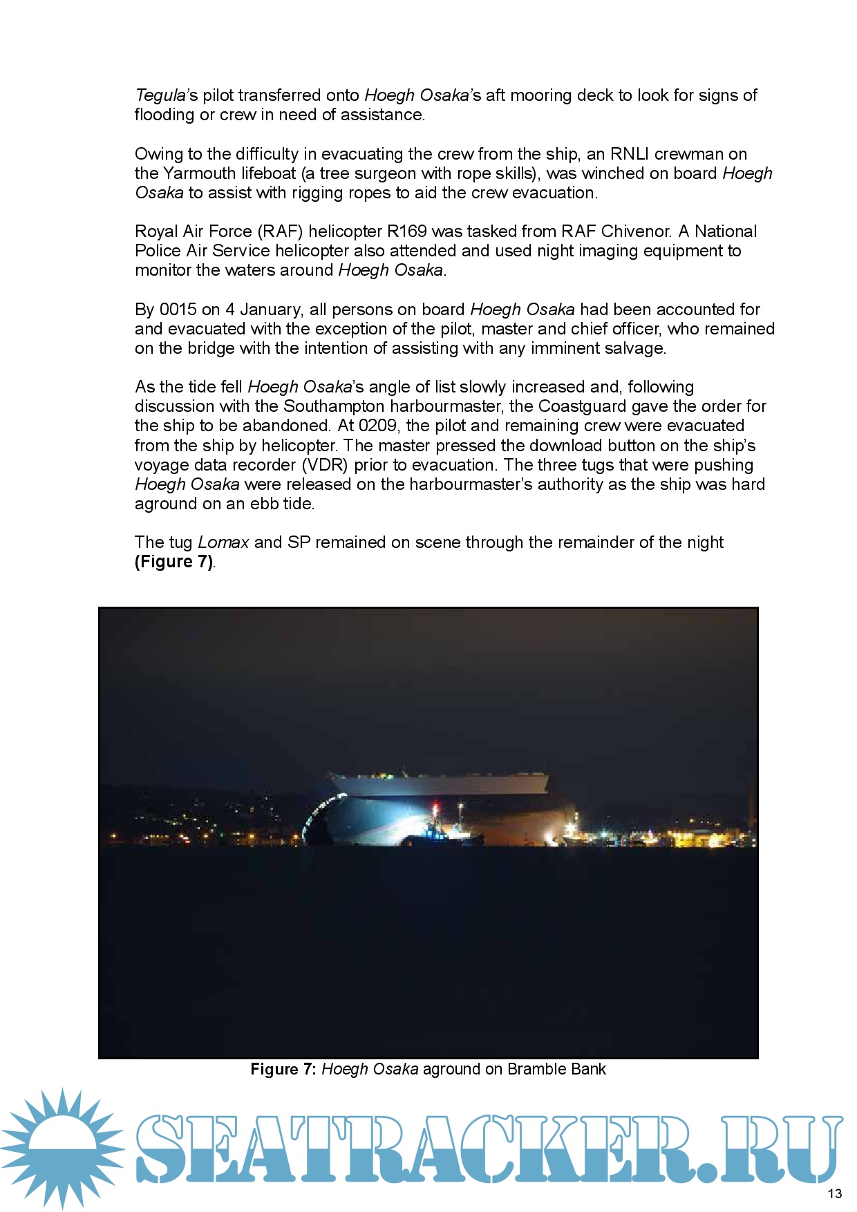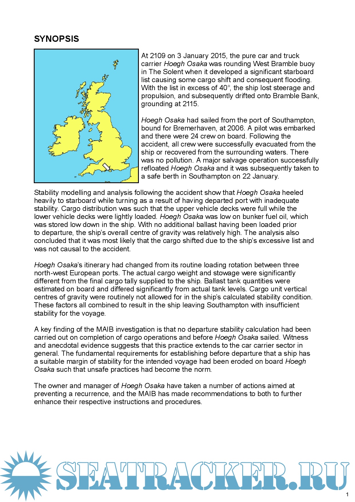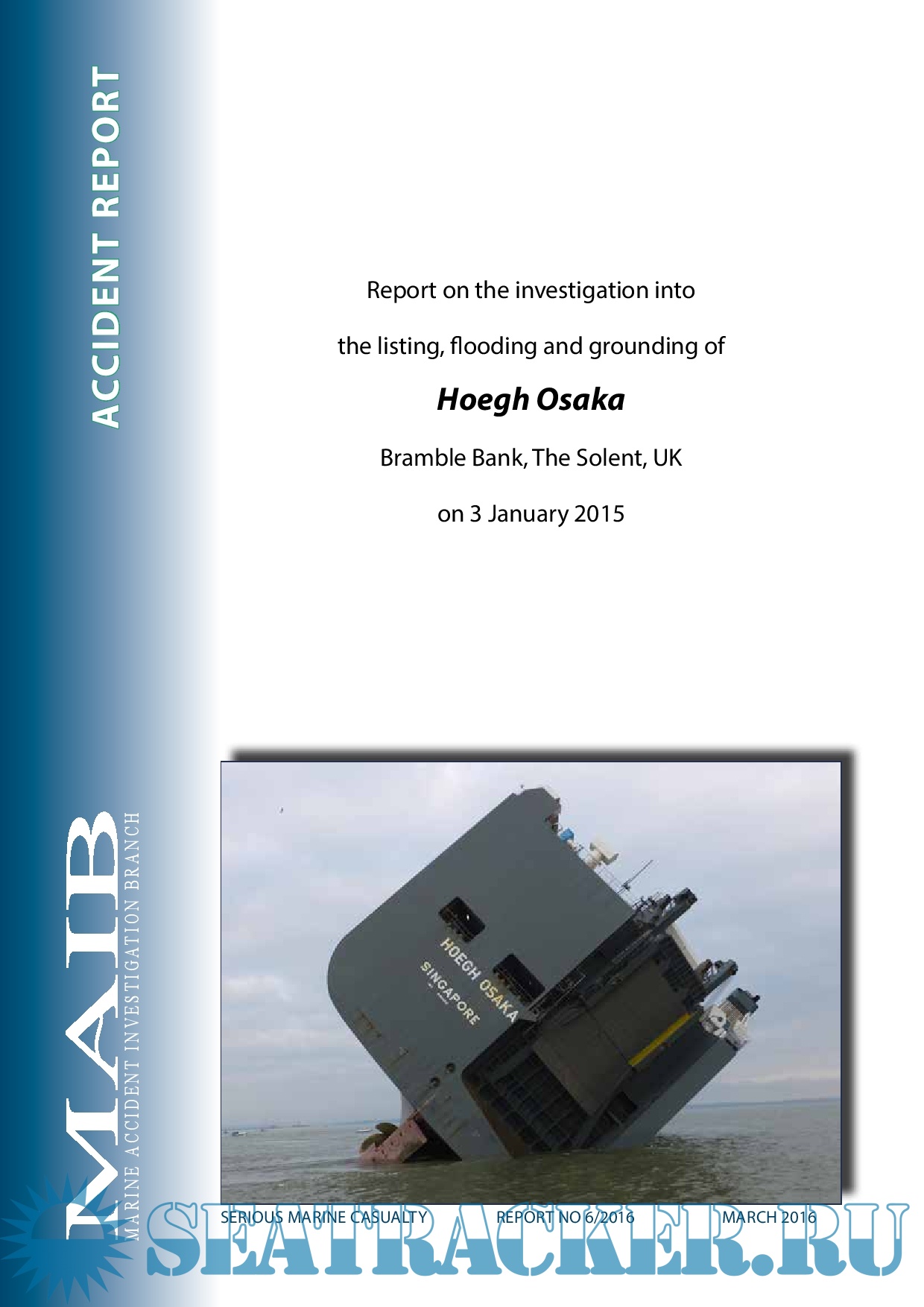 Description: At 2109 on 3 January 2015, the pure car and truck carrier Hoegh Osaka was rounding West Bramble buoy in The Solent when it developed a significant starboard list causing some cargo shift and consequent flooding. With the list in excess of 40°, the ship lost steerage and propulsion, and subsequently drifted onto Bramble Bank, grounding at 2115.