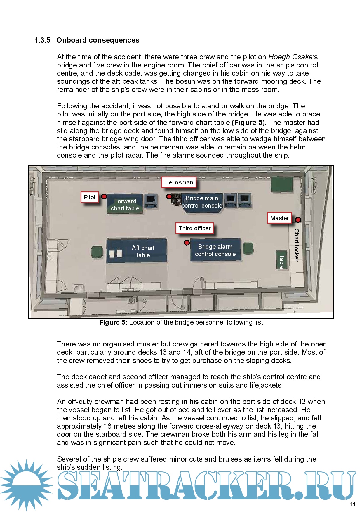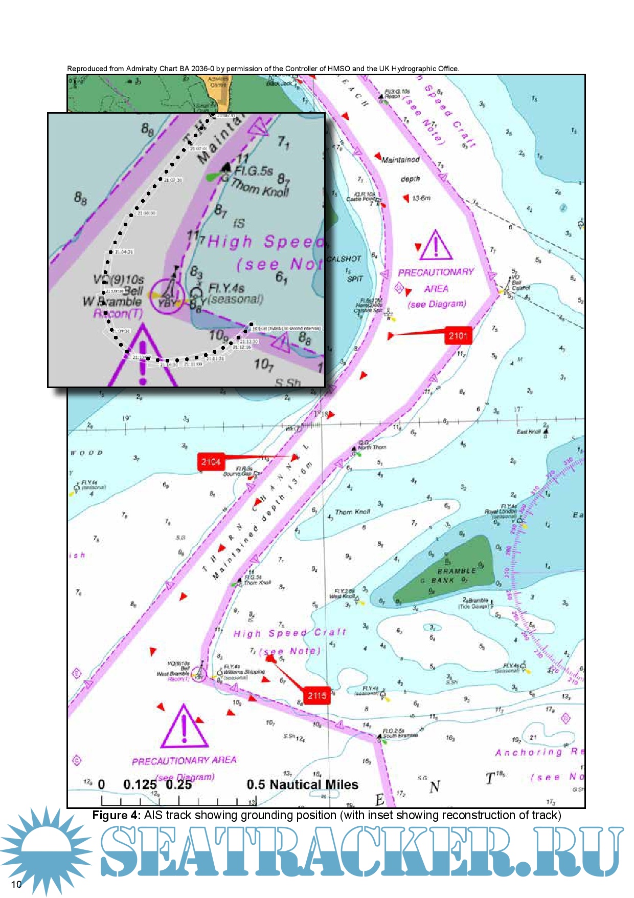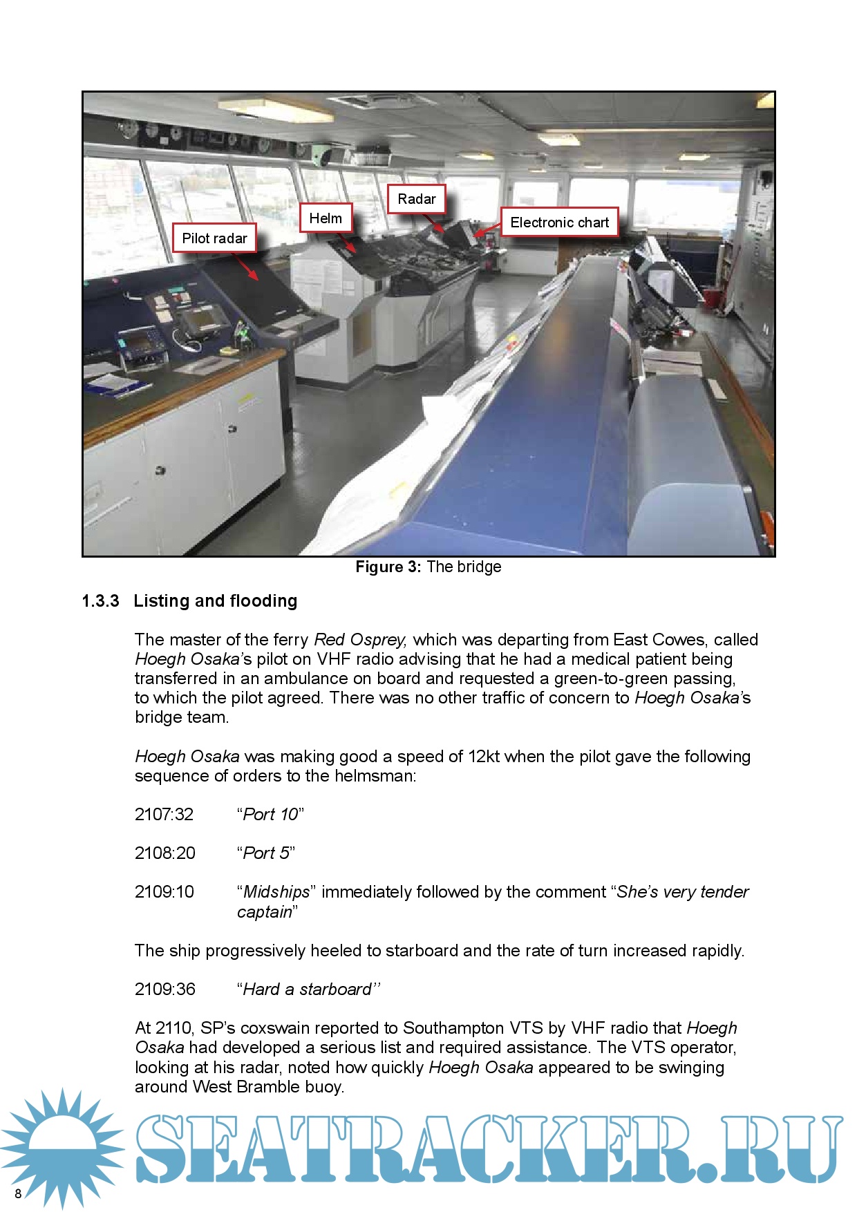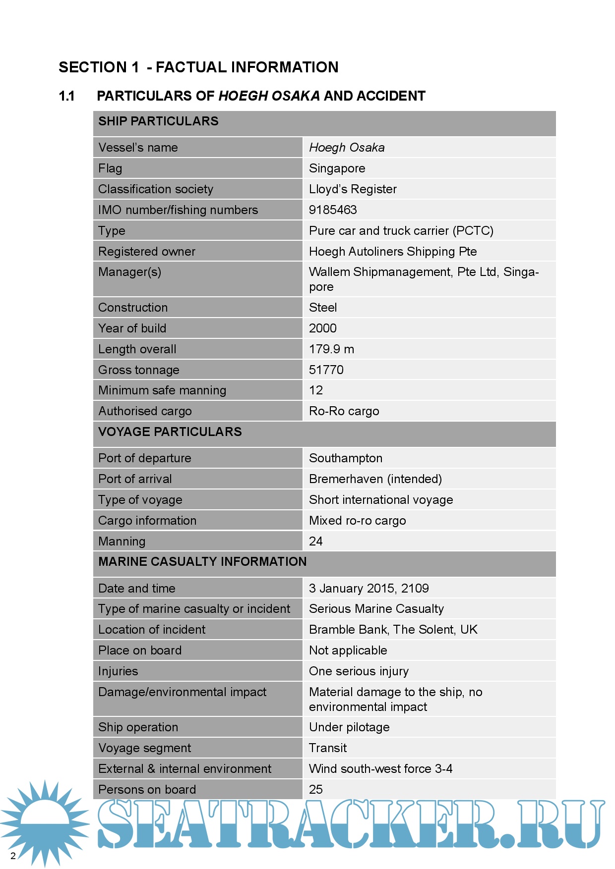Description: At 2109 on 3 January 2015, the pure car and truck carrier Hoegh Osaka was rounding West Bramble buoy in The Solent when it developed a significant starboard list causing some cargo shift and consequent flooding. With the list in excess of 40°, the ship lost steerage and propulsion, and subsequently drifted onto Bramble Bank, grounding at 2115.