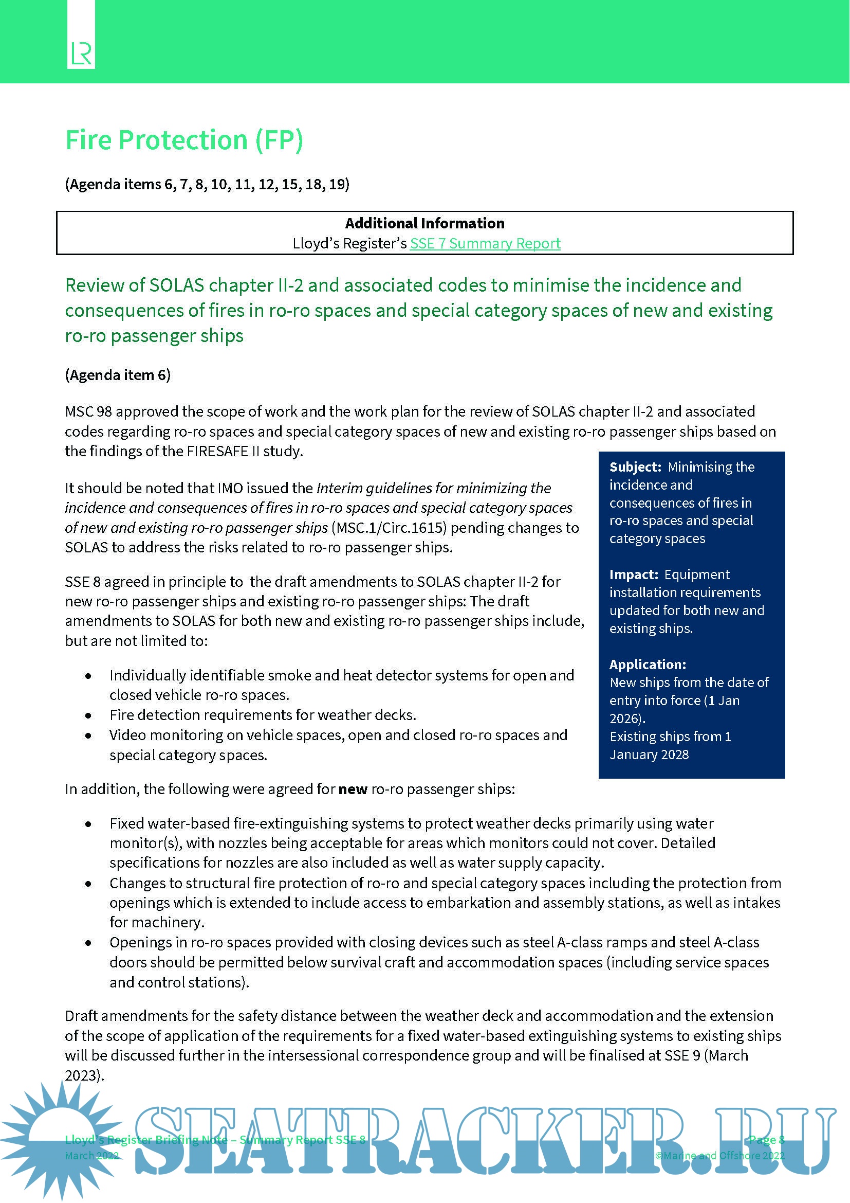 LR Summary Report for the IMO Ship Systems and Equipment Sub-Committee (SSE 8)