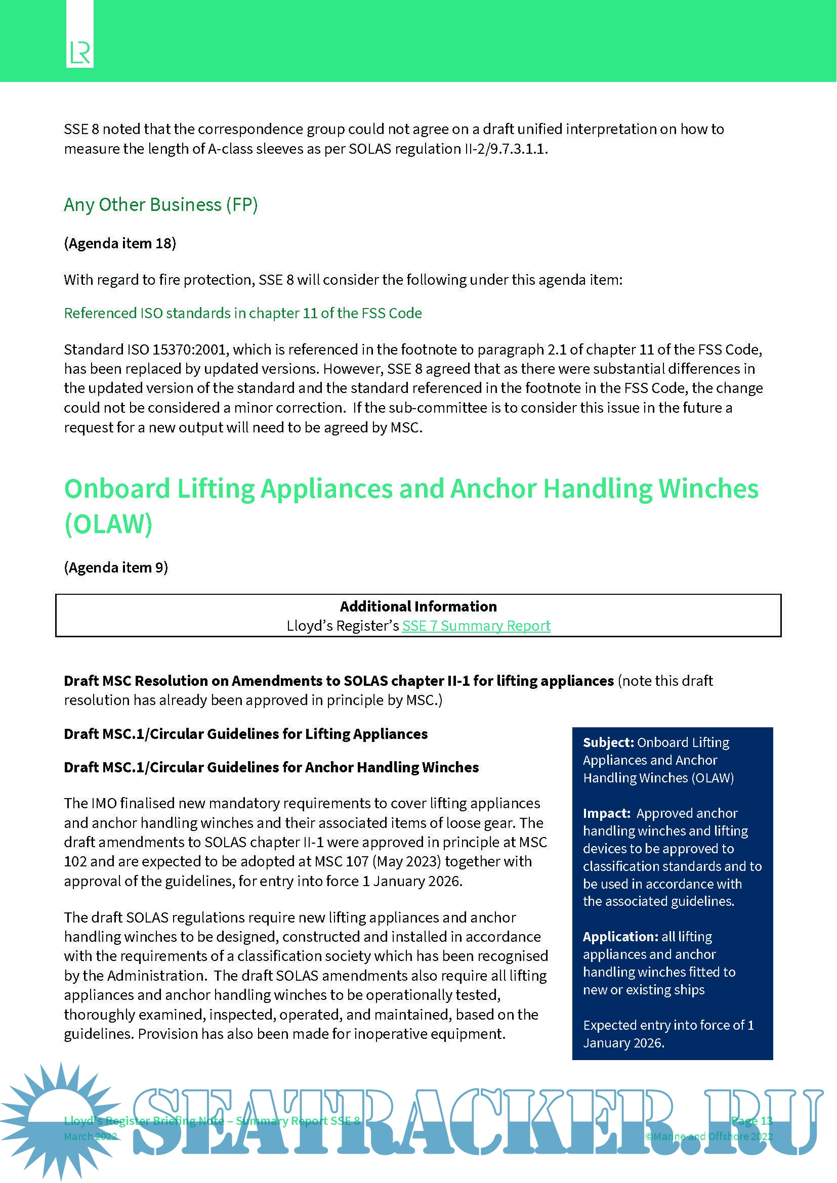 LR Summary Report for the IMO Ship Systems and Equipment Sub-Committee (SSE 9) - Lloyd's…