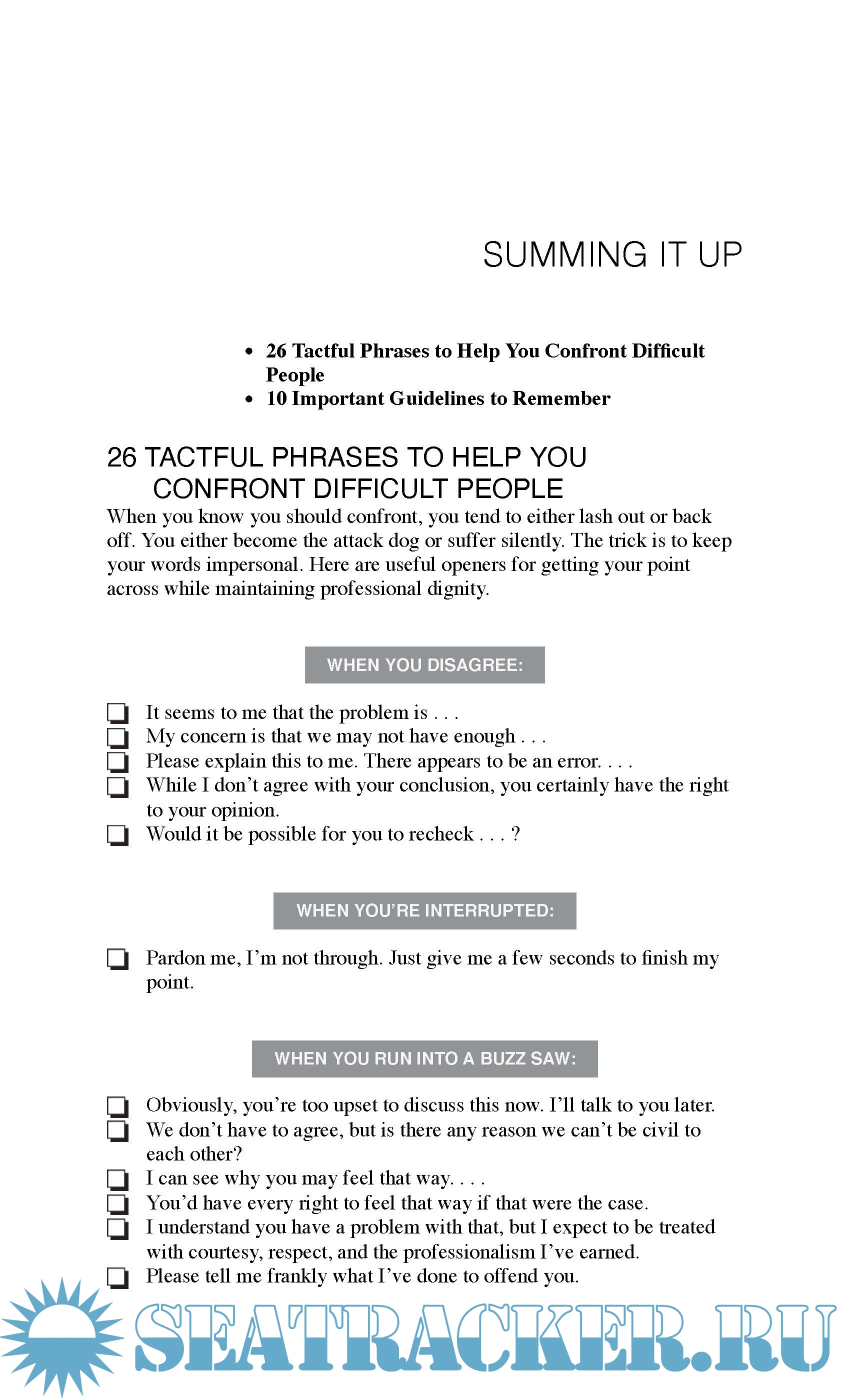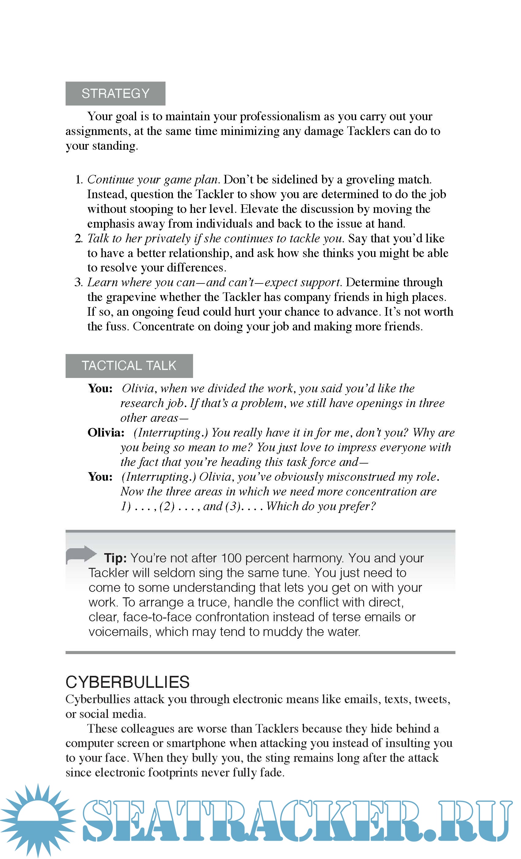 Updated and revised to reflect modern issues including technology, generation gaps, and language barriers, this guide describes 10 kinds of culprits, from tyrants and bullies (regular and cyber) to the pushy and presumptuous to connivers and camouflagers; and offers helpful strategies and phrases for diffusing workplace tensions and effectively resolving conflicts.