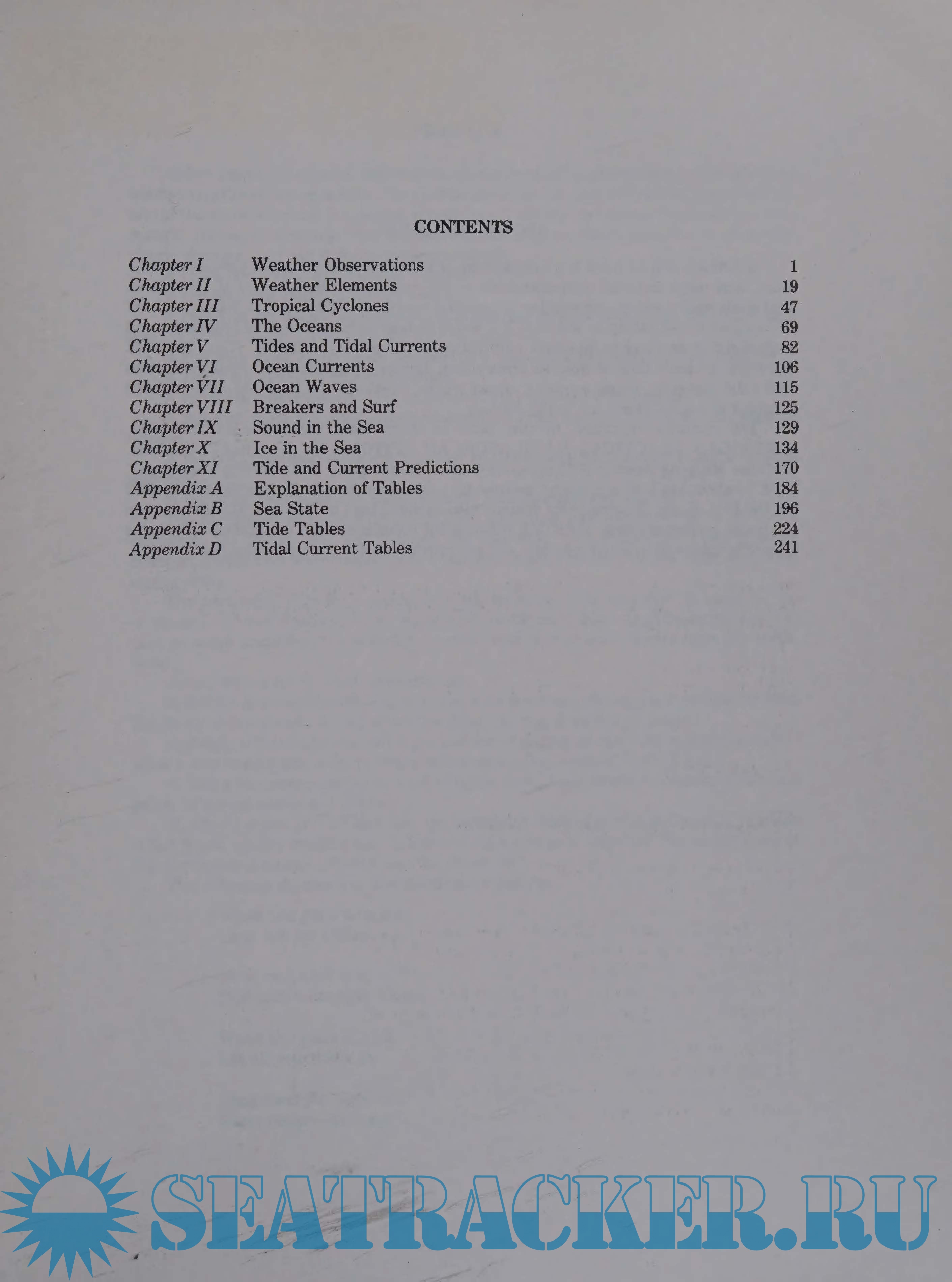 The material reprinted in this book is taken from the latest edition, 1977, AMERICAN PRACTICAL NAVIGATOR: AN EPITOME OF NAVIGATION (U.S. Defense Mapping Agency Hydrographic Center, Washington, D.C., 20390); "Bowditch," as it is called, has been a primary resource for yachtsmen since its first publication in 1802 by the U.S. Navy. Because of its voluminousness many boat owners are reluctant to keep it aboard for lack of space. MARINE WEATHER is designed to be taken aboard, includes essential information about weather, and can provide interesting reading on rainy days.