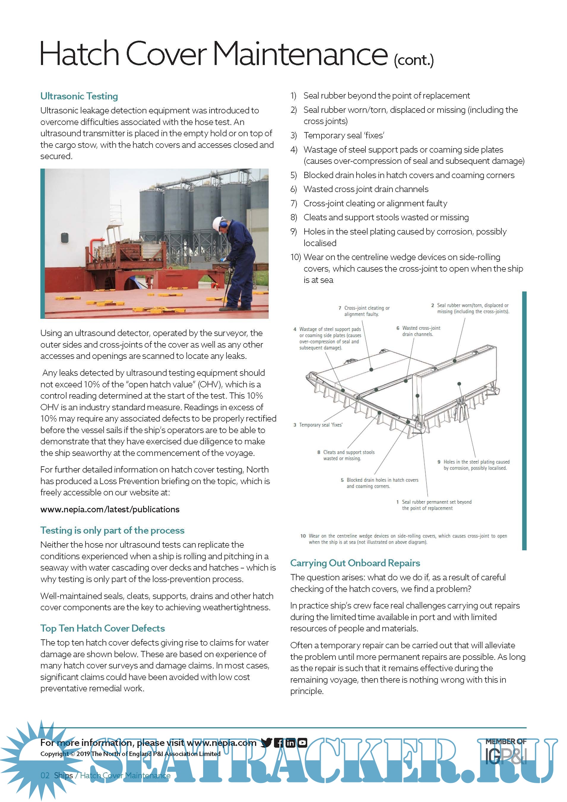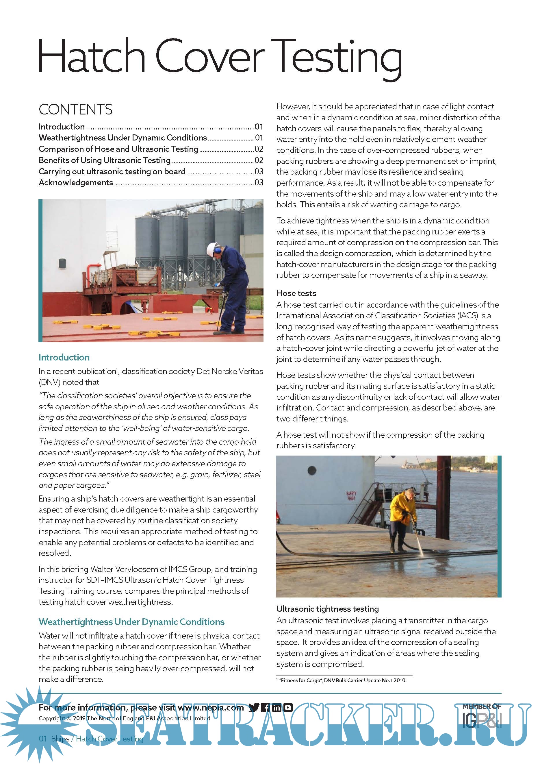 Year: 2019 Language: english Author: the North Genre: Practical guide Format: PDF Quality: eBook Pages count: 12 Description: the First briefing aims "Hatch Cover Maintenance" to raise awareness amongst Members and ship’s staff of the common causes of ingress claims and how these causes can be avoided through best practice. In the Second this briefing aims "Hatch Cover Testing" - Walter Vervloesem of IMCS Group, and training instructor for SDT–IMCS Ultrasonic Hatch Cover Tightness Testing Training course, compares the principal methods of testing hatch cover weathertightness.