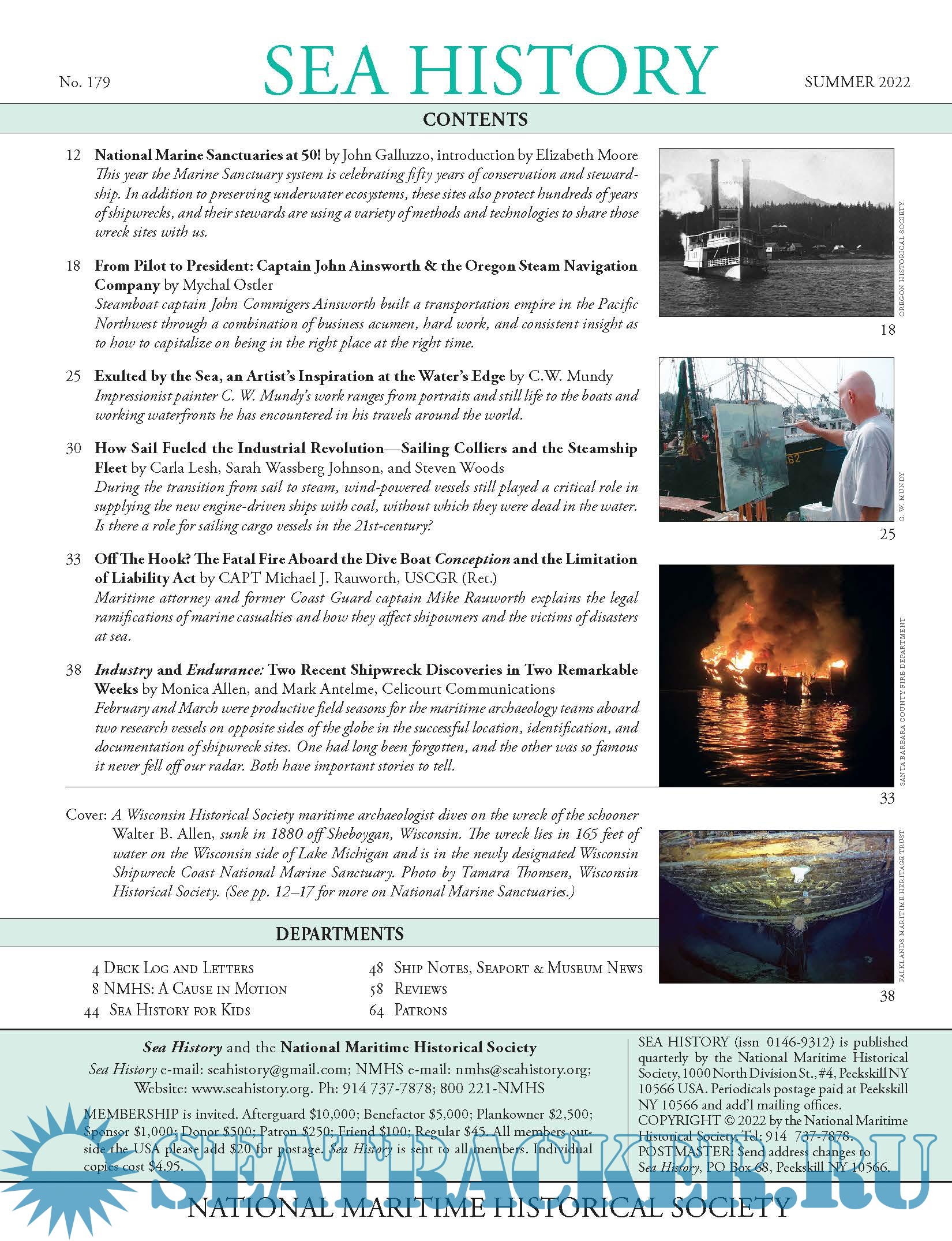Our seafaring history comes alive in the pages of Sea History, the National Maritime Historical Society’s quarterly magazine. The pre-eminent journal of advocacy and education in our field, Sea History covers the world of maritime museums, sail training, key events and people in our maritime past, and the stories of everyday sailors past and present, and marine archaeology, with a national focus and an international scope, as well as these regular features.
